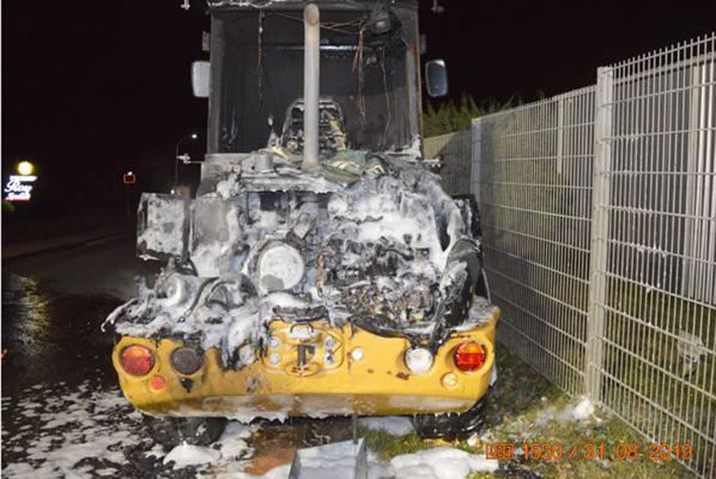 Das Fahrzeug stand an der Einmündung zur Straße Kleefeld, wo ein Zeuge den Entstehungsbrand wahrgenommen hatte und die Polizei informierte. Die Baumaschine brannte trotz Ablöschens durch die alarmierte Feuerwehr im Motorbereich komplett aus.