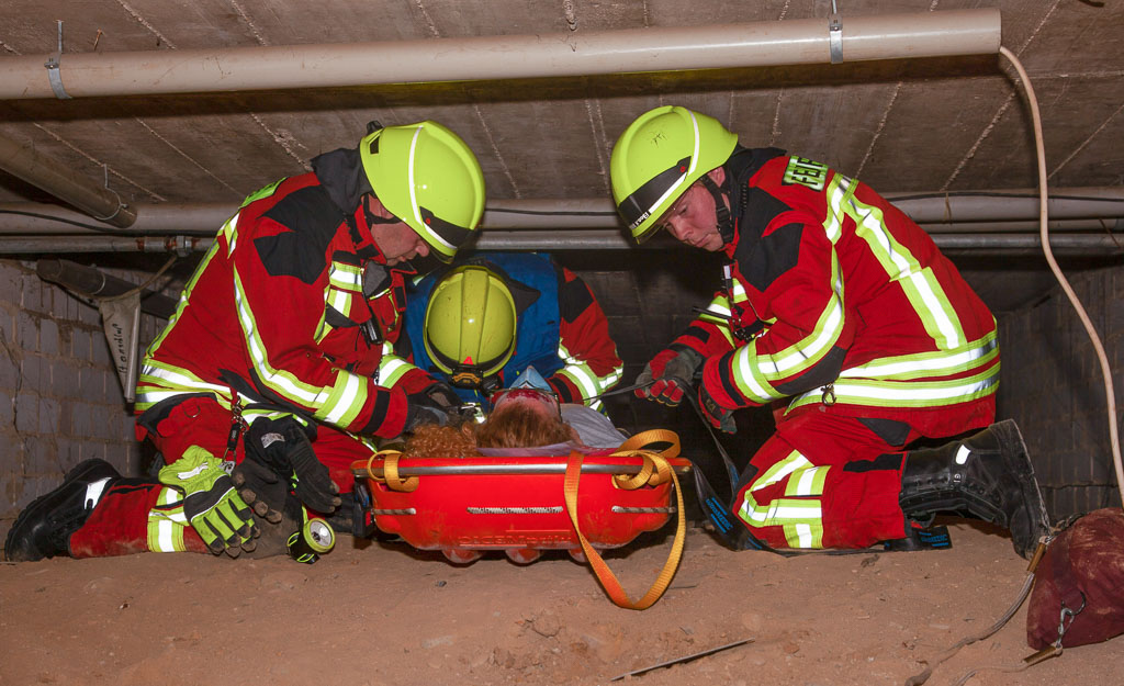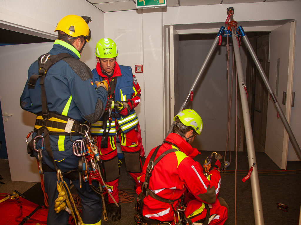 Während sich der Rettungsdienst um den Patienten kümmerte, wurde von der Höhenrettung ein Dreibein und die Seilstrecken aufgebaut. Gleichzeitig stiegen zwei Höhenretter mit einer Trage ebenfalls in den Aufzugschacht. Nachdem der Verletzte schonend in die Rettungstrage gelagert wurde, begann die Rettung nach oben. Auch dieses lief reibungslos ab.