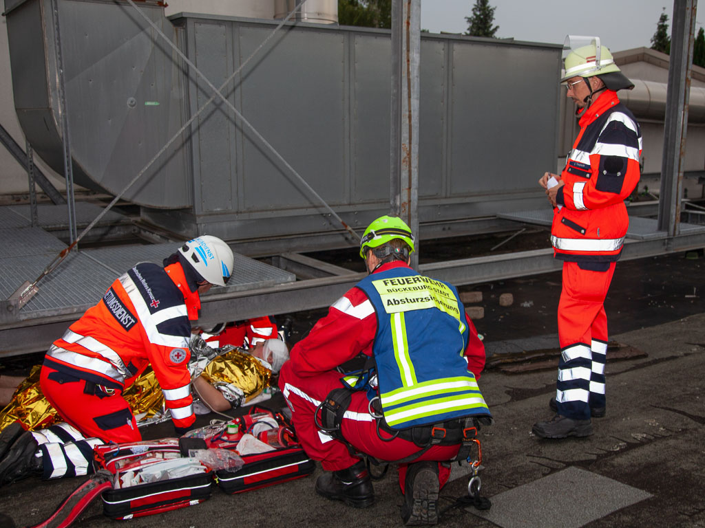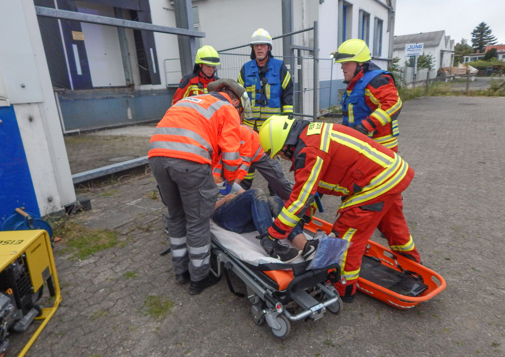Natürlich wurde parallel auch an der Rettung der Person im Aufzugsschacht gearbeitet. Diese Aufgabe stellte gerade für die Auszubildenden vom Rettungsdienst eine ungewohnte Situation dar, denn sie mussten warten, bis von der Höhenrettung der Zustieg zum Patienten per Leiter sichergestellt wurde. Dieses dauerte dementsprechend länger, was aber in solchen Lagen normal ist.