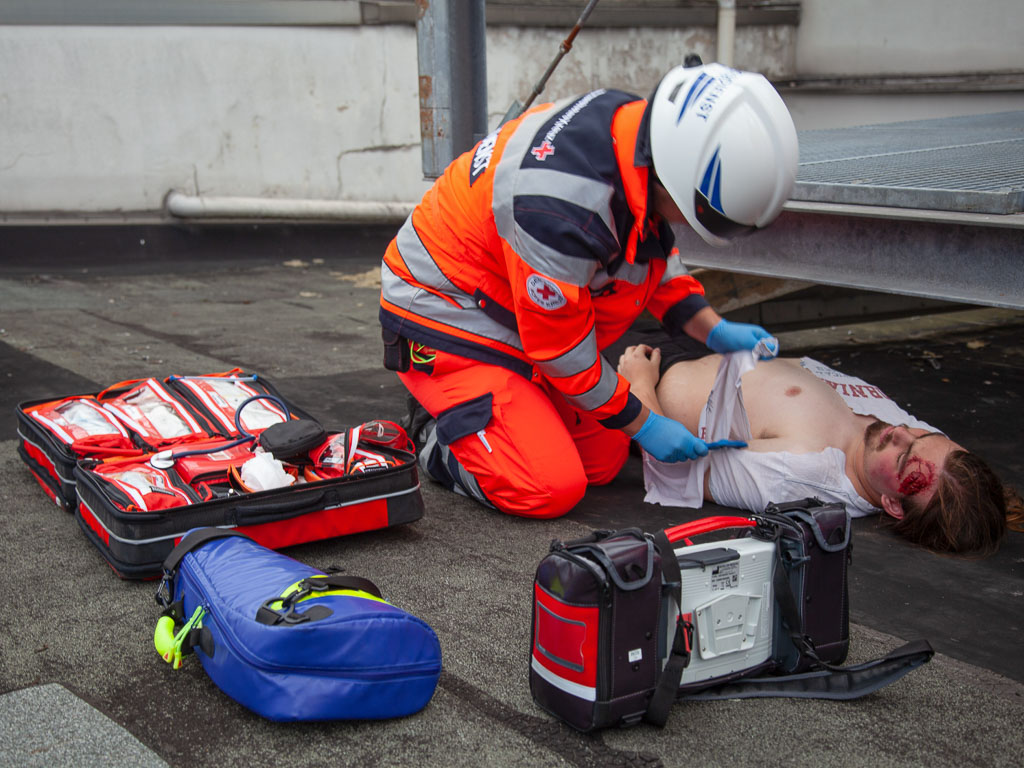 Nach der Erkundung stellte sich folgende Lage dar: Im verrauchten Kellerbereich sollte sich eine Person befinden, die unter Atemschutz gesucht und gerettet werden muss. In einem rauchfreien Kriechkeller liegt eine weitere Person mit schweren inneren Verletzungen. Auf dem Dach befindet sich eine weitere, mit dem Bein eingeklemmte, verletzte Person. Eine vierte verletzte Person liegt auf einem Lastenaufzug im Aufzugsschacht.