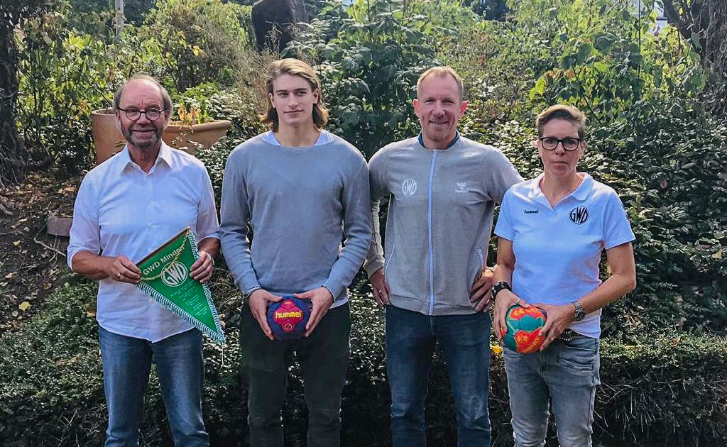 Von links: Reinhard Stemme, Juri Knorr (GWD Spieler), Frank Carstens (GWD Trainer) und Anke Brinkmann (GWD Mitarbeiterin Geschäftsstelle) (Foto: pr)