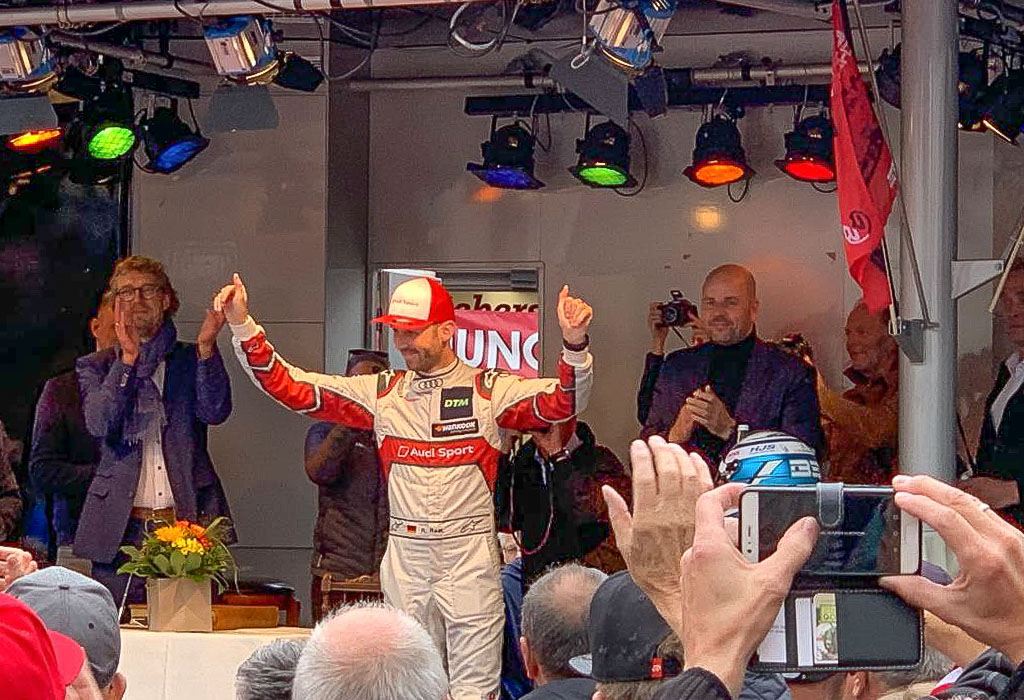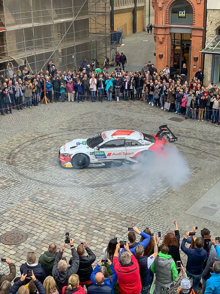 Nach dem Pressetermin im Victoria Hotel fuhr der zweifache DTM-Meister in seinem Siegerauto, einem ca. 600 PS starken „Audi RS5 DTM“ eine „Ehrenrunde“ und ließ die Reifen bei einem effektvollen „Donut“ auf dem Kopfsteinpflaster qualmen. Fans zückten ihre Kameras und Smartphones und hielten den Moment fest. Dem Rennfahrer wurde übrigens noch eine weitere Ehre zuteil: Der Eintrag ins Goldene Buch der Stadt Minden.