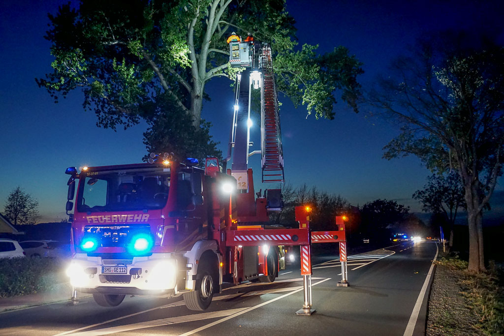 Die alarmierte Feuerwehr aus Wiedenbrügge forderte aufgrund der Höhe des Baumes die Hubrettungsbühne aus Stadthagen an und sperrte die Straße. Mit Hilfe der Hubrettungsbühne wurde der Ast aus der Krone und weiteres Geäst, was abzubrechen drohte, entfernt. Während der rund zweistündigen Arbeiten mußte die Bundesstraße vollgesperrt werden. Der Verkehr wurde örtlich umgeleitet. (pr/Foto: pr)