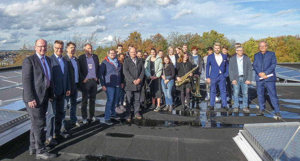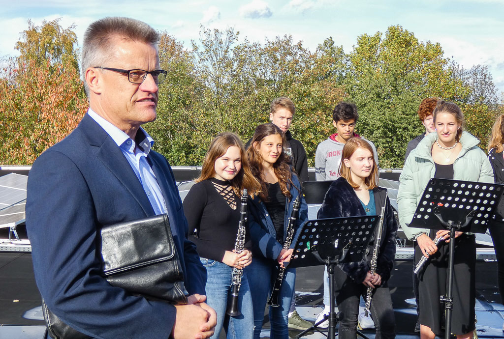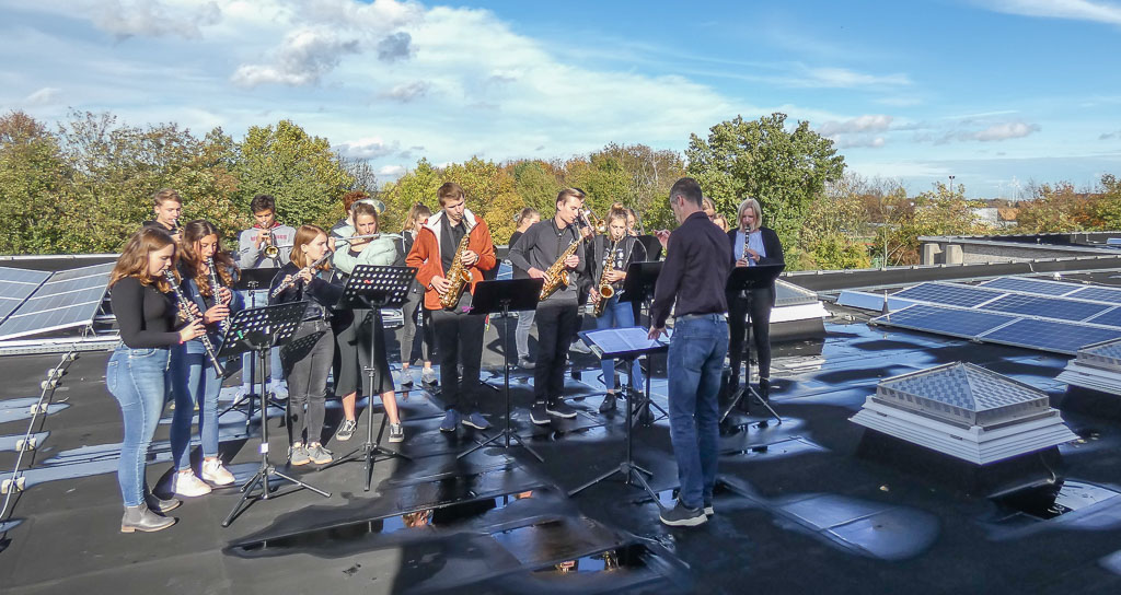 Die Anlage auf dem Dach des Gymnasiums Bad Nenndorf ist die Größte und wurde in nur 14 Tagen von der Firma Ahrens Dachtechnik aufs Dach gebaut. Ein Teil der Big Band spielte unter der Leitung von Carsten Groß zur Begrüßung bei strahlendem Sonnenschein auf dem Dach das Präludium des Te Deum von Marc-Antoine Charpentier, besser bekannt als die Eurovisionshymne. (sk/Fotos: sk)