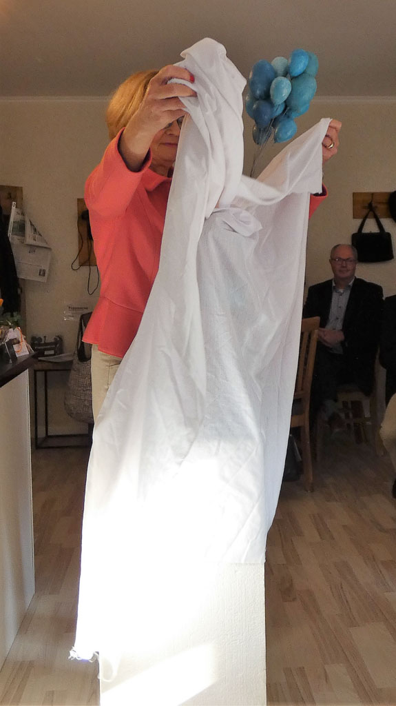 Die Skulptur soll Leichtigkeit, Freiheit, Freude, Vergangenheit und Zukunft ausdrücken, so Ritter weiter. „Ich liebe Herausforderungen“ sagt lächelnd die Künstlerin Martina Reis. „Zuerst malte ich die Skulptur, dann fotografierte ich meine Kinder in ähnlicher Handposition, so wie die beiden Kinder die die Luftballons festhalten, so erklärte Reis den geladenen Gästen die künstlerische Umsetzung.