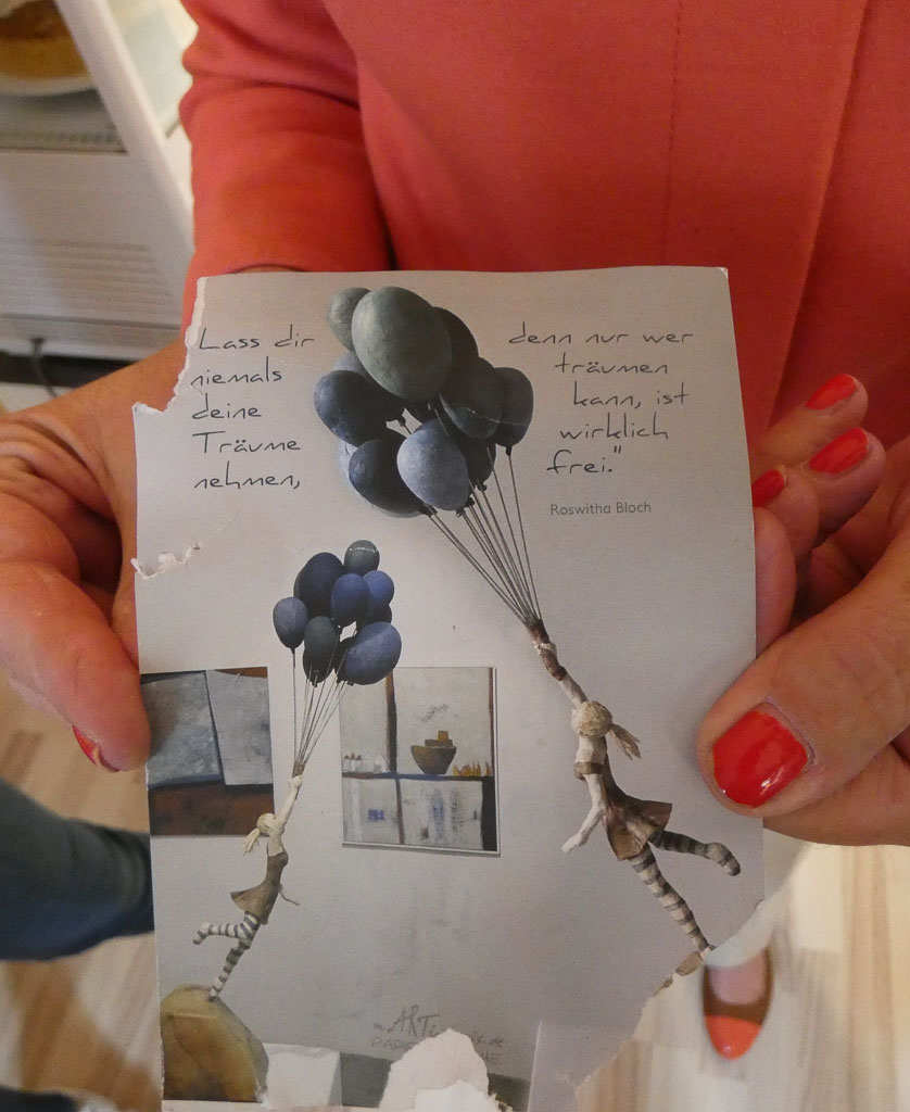 Die über die Jahre gewachsene Partnerschaft zwischen Schaumburg und Soissons ist sowohl fest im Boden verankert, als auch durch ihr zukunftsorientiertes Handeln geprägt, so Petra Ritter. Die Idee entstand aufgrund einer Postkarte (siehe Foto), die Petra Ritter so schön fand, dass sie die Künstlerin bat, doch bitte ein ähnliches Kunstwerk als Gastgeschenk zu gestalten. Die Postkarte ziert ein Mädchen aus Pappmaché, die Luftballons festhält. Das entstandene Gastgeschenk (Luftballons in den Händen haltend von einem Jungen und einem Mädchen), wurde von Martina Reis sehr ausdrucksstark und liebevoll bis ins kleinste Detail umgesetzt.