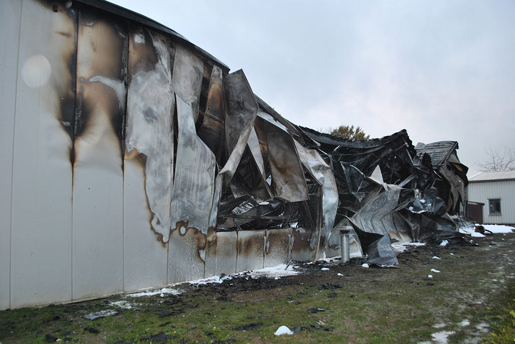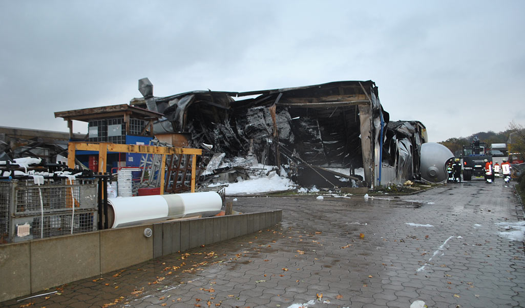 In Mitleidenschaft wurde auch eine angrenzende Lagerhalle des Unternehmens gezogen, die durch die Hitzeentwicklung Beschädigungen an der Fassade davontrug. (po/Fotos: Polizei)