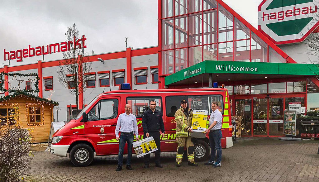 Der Baumarkt spendete freundlicherweise einen Hochdruckreiniger und einen Industriestaubsauger an die Brandschützer. Hiermit können die Feuerwehrleute beispielsweise nach einem Brandeinsatz direkt an der Einsatzstelle oder vor dem Gerätehaus die benutzten Gerätschaften mit dem Hochdruckreiniger säubern und das Gerätehaus und die Innenräume des Fahrzeuges mit dem Staubsauger absaugen.