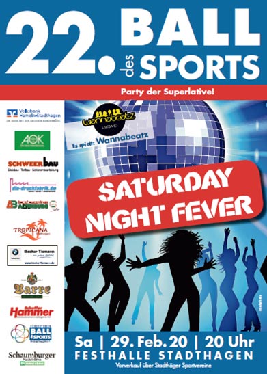 (Stadthagen) Der 22. Ball des Sports steht unter dem Motto „Saturday Night Fever“. Am Samstag den 29. Februar 2020 startet die beliebte Party der Superlative in der Stadthäger Festhalle.
