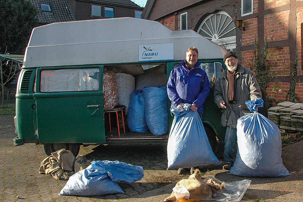Diese lagerten zuletzt in einer durch den Kassenwart des NABU Stadthagen angemieteten Halle: ganze 18 Säcke mit einem Inhalt von je 240 Liter und einem Gewicht von über 30 Kilogramm stapelten sich hier. Doch wohin damit? „Üblicherweise werden die Korken über unsere Kork-Kampagne von einem Paketdienst kostenfrei abgeholt“, erklärt Rummel. Der Erlös aus dem Verkauf der Korken kommt dem Kranichschutz in Spanien, der Heimat der Korkeichen, zu Gute. Die Abholung gilt jedoch nur für kleine, handliche Pakete. Der Haken bei größeren Mengen: es müssen mindestens 25 Säcke voll sein, bis ein LKW die Naturkorken auch vor Ort abholen kommen kann. Doch für die Säcke, die bis heute einen Dornröschenschlaf in einer Lagerhalle hielten, musste bis zum Jahresende eine kurzfristige Lösung gefunden werden, denn diese rein private Lagermöglichkeit steht dem NABU Stadthagen nicht mehr zur Verfügung.