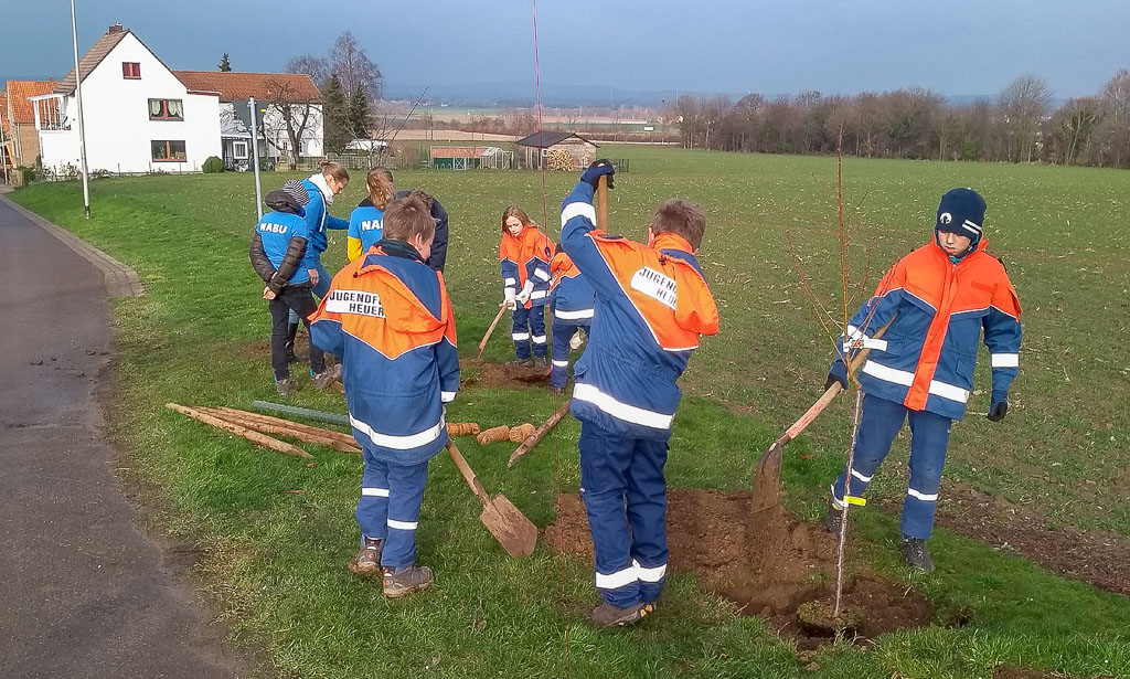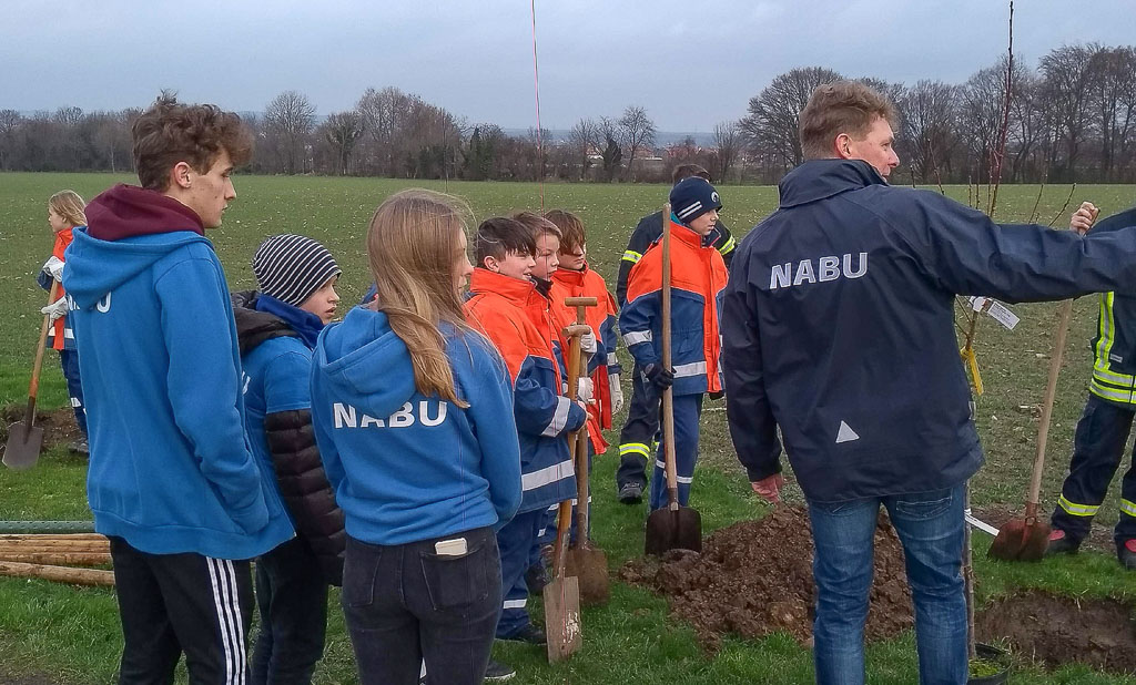 (Lindhorst/Heuerßen) In einer Gemeinschaftsaktion haben der NABU Lindhorst, die Gemeinde Heuerßen und die Jugendfeuerwehr Heuerßen im Rahmen eines von der Niedersächsischen Bingo-Umweltstiftung geförderten Mitmach-Projekts des NABU Niedersachsen Obstbäume alter Sorten gepflanzt. Über alte Obstsorten wie „Mirabelle von Nancy“ und zwei alte deutsche Pfirsichsorten freuen sich die Aktiven ebenso wie die Insekten- und Vogelwelt.