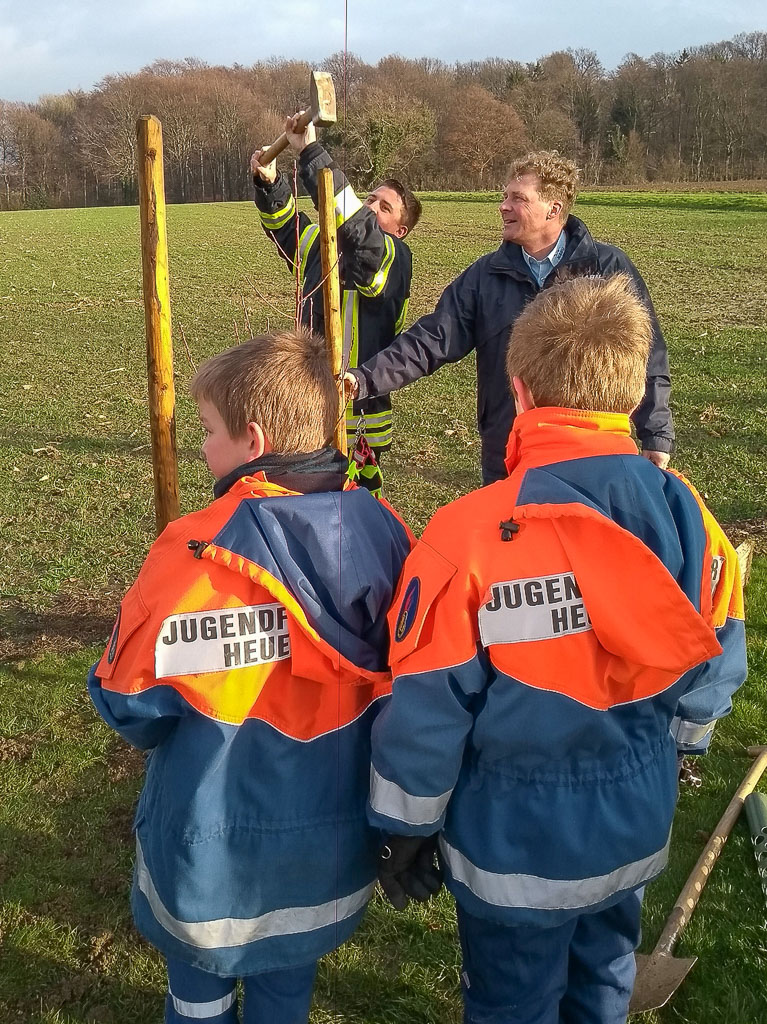 Hervorzuheben ist, dass die Gemeinde Heuerßen nicht nur unkompliziert ihre Fläche am Ortsrand für die Pflanzung zur Verfügung gestellt hat, sondern die Pflanzgruben im Vorfeld hat ausheben lassen. Der stellvertretende Bürgermeister Christoph Meier, selbst auch im NABU aktiv, hat direkt bei der Pflanzung fachkundig mit Hand angelegt. Die Pflanzung vorgenommen haben ansonsten Kinder und Jugendliche von Jugendfeuerwehr Heuerßen und NABU. Mit Schaufel und Spaten hat der Einsatz für die Natur allen sichtlich Spaß bereitet und wird allen noch lang in Erinnerung bleiben. Denn auch das Wetter spielte mit: War es während der Aktion trocken, fing es erst kurz nachdem die letzten Bäume eingepflanzt waren an zu regnen.
