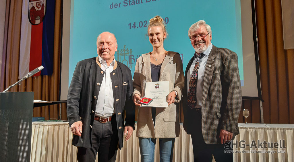 Die Ehrungen selbst nahm der Bürgermeister dann gemeinsam mit dem Vorsitzenden des Sport- und Partnerschaftsausschusses, Wolfhard Müller vor. In kurzen Abständen kamen die Sportler nach vorne auf die Bühne um sich Urkunden und Medaillen abzuholen. Ehrungen gab es auch für die Bereiche Sportschießen, Tischtennis, Bosseln, Laufen und Fußball. Im Bereich Leichtathletik bekam Merle Homeier ihre Ehrung. Sie erreichte den 2. Platz der deutschen Meisterschaft Frauen und Frauen AK U 23, ebenso den 3. Platz der deutschen Hallenmeisterschaft Frauen Weitsprung und den 4. Platz Europameisterschaft Weitsprung AK U23.