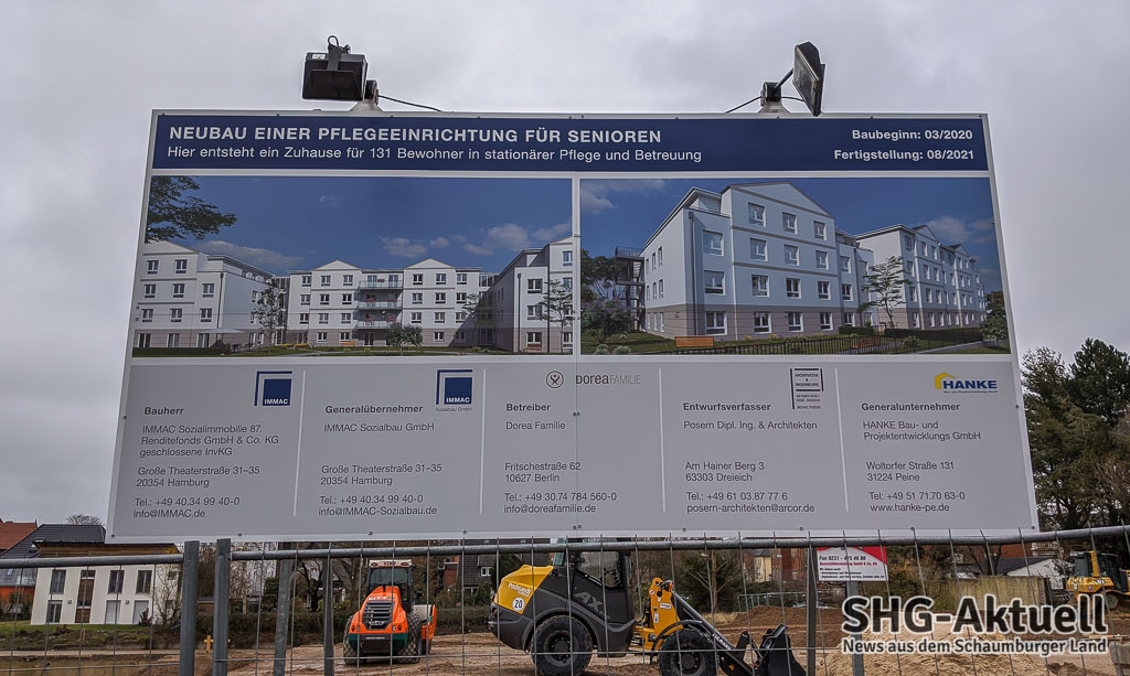 Das Bauprojekt wird von der IMMAC betreut. Mit den Erdarbeiten für den Bau des Alten- und Pflegeheims wurde bereits Ende Januar begonnen. Als Bauzeit veranschlagt die zuständige IMMAC Sozialbau etwa 18 Monate. Startschuss für den Bau der Senioren-Service-Wohnungen ist der 4. Mai 2020. Die zuständige Firma ist die IMMAC Wohnbau. Sie rechnet mit der Fertigstellung der drei Häuserkomplexe im September 2021.