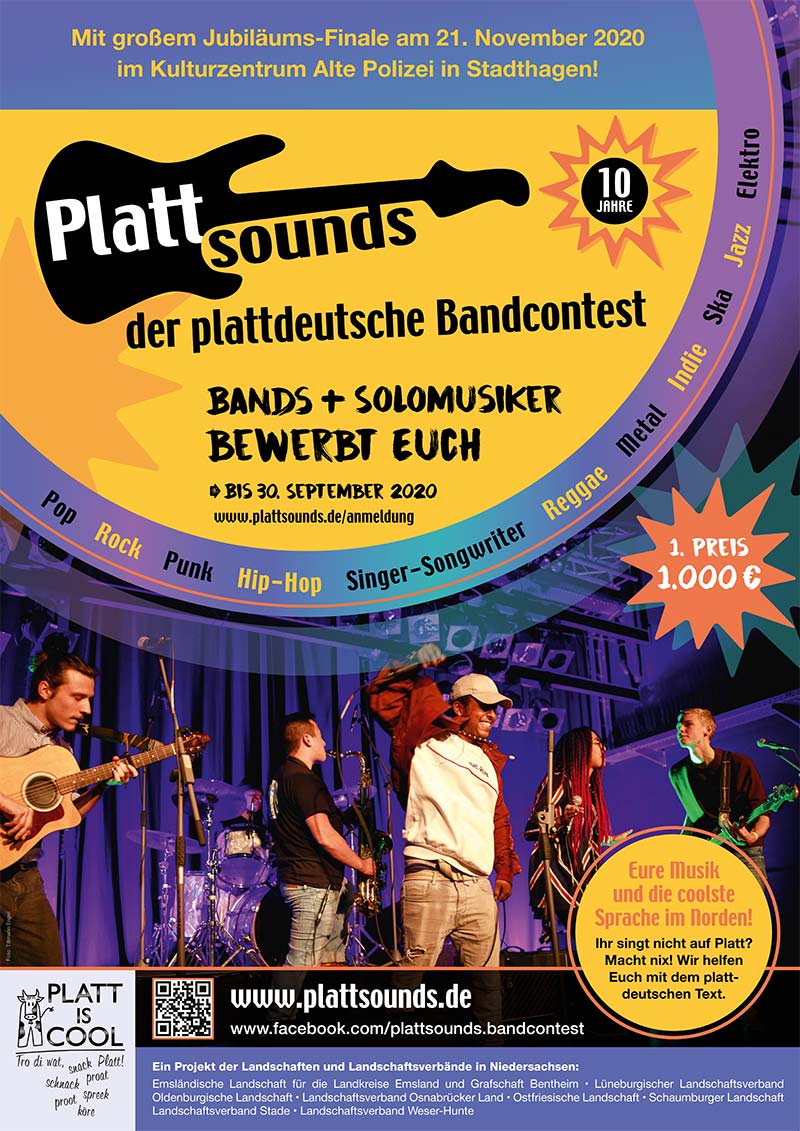 (Bückeburg/Stadthagen) Besondere Klänge zu einem besonderen Jubiläum: Bereits zum zehnten Mal findet am 21. November 2020 der plattdeutsche Bandcontest Plattsounds statt, für den sich Bands und Einzelmusiker ab jetzt bewerben können. Gesucht werden junge Musiker aus Niedersachsen, die Songs aus Genres wie Rock, Pop, Hip Hop, Urban, Electro, Punk, Reggae, Metal oder Singer/Songwriter in der beliebten Sprache Platt performen wollen. Beim Finale im Kulturzentrum Alte Polizei in Stadthagen treten zehn Finalisten auf und zeigen, wie gut Plattdeutsch und moderne Musik zusammenpassen.