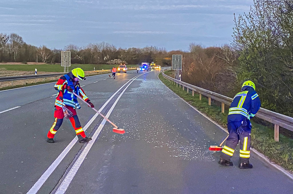 Als besonders stellte sich ein Einsatz auf der Bundesstraße 65 heraus. Auf der Fahrbahn lagen auf ca. 100 Metern Glasscherben verteilt. Diese wurden von den Einsatzkräften zusammengefegt und anschließend durch ein Abschleppunternehmen entsorgt.