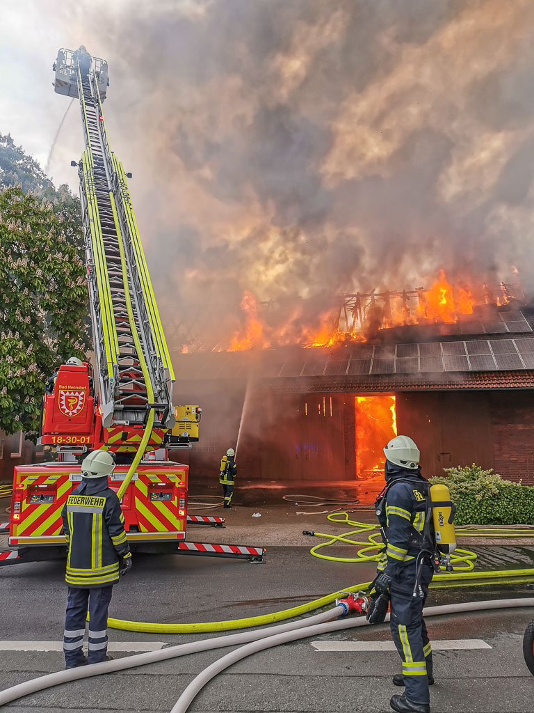 Die Flammen drohten relativ schnell, auf das benachbarte Wohnhaus überzugreifen, aus dem sich die Bewohner in Sicherheit bringen konnten. Mehrere Atemschutztrupps schafften es im letzten Moment, ein Übergreifen auf die Wohnräume zu verhindern. Zeitnah wurde die Drehleiter aus Wunstorf dazu gerufen, um von zwei Leitern aus die Flammen zu bekämpfen.
