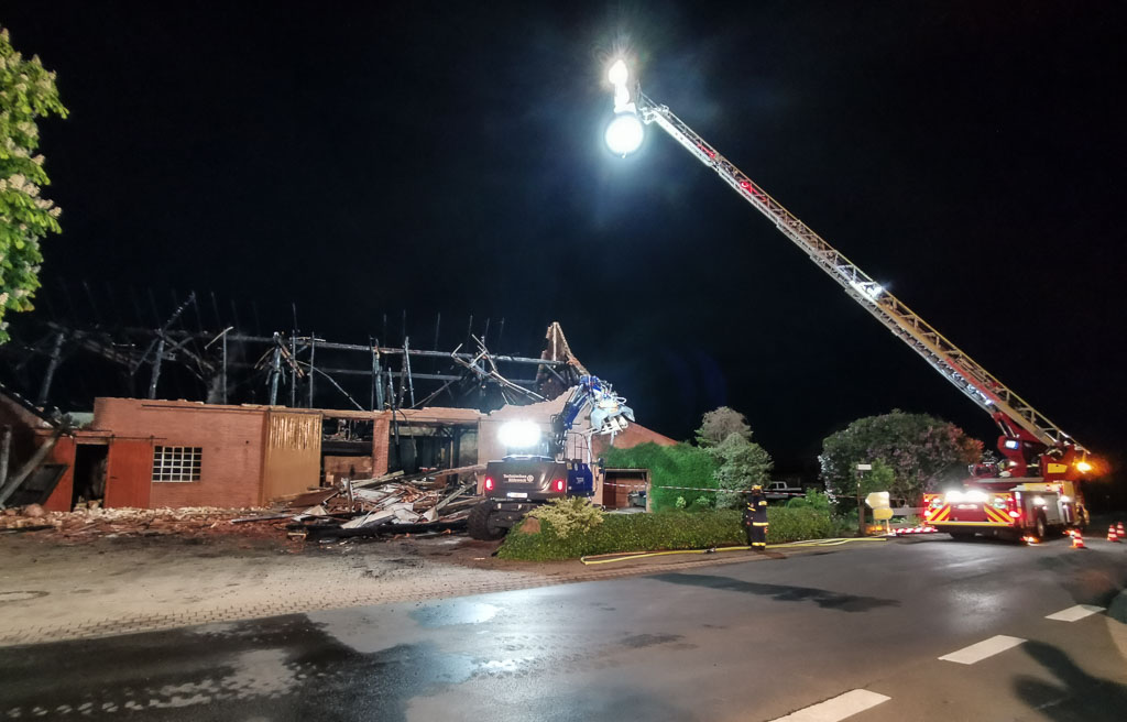 Die Nachlöscharbeiten dauerten noch bis zum Morgen. In der Nacht wurde noch ein Bagger des THW Stadthagen hinzugezogen, um das vom Einsturz gefährdete Vordach abzureißen. Verletzt wurde im Einsatzverlauf niemand.