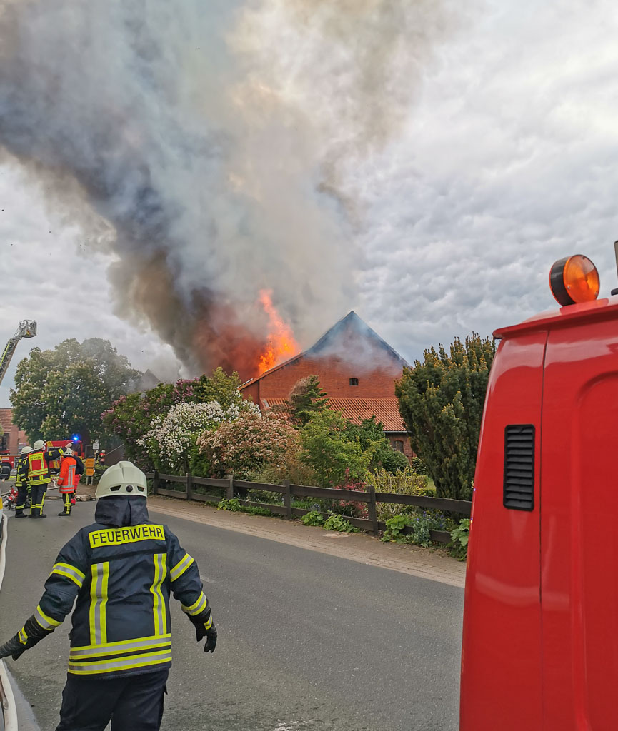 Bereits auf der Anfahrt war eine starke Rauchentwicklung zu erkennen. Im Dachbereich der brennenden Scheune kam es im weiteren Einsatz zu einer sogenannten Durchzündung, einem plötzlichen und schlagartigen Entzünden von heißen, brennbaren Gasen, wodurch die komplette Scheune in Vollbrand geriet.
