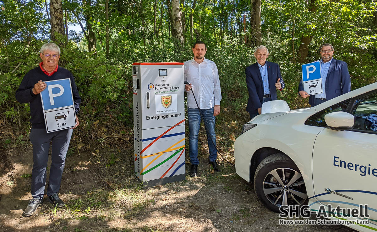 Auf dem Gelände des Golfclubs in der Röserheide wurde jetzt eine neue Stromladesäule offiziell eingeweiht. Wie der Vize-Präsident des Golfclubs, Werner Nickel, zu berichten weiß, häuften sich in letzter Zeit unter den 734 Mitgliedern die Nachfragen nach einer Lademöglichkeit fürs eigene E-Mobil. Nachdem man sich mit den Stadtwerken Schaumburg-Lippe beraten hatte, wurde kurzerhand ein neuer Hausanschluss verlegt und eine Ladesäule installiert. Sie verfügt über zwei Ladeanschlüsse mit je 22 kW maximaler Ladeleistung und wurde jetzt von Stadtwerke-Geschäftsführer Eduard Hunker, Vertriebsleiter Daniel Strathmann, Golfclub-Präsident Hans-Heinrich Hahne und Projektbetreuer der Westfalen Weser Netz GmbH, Lars Germer, in Betrieb genommen.