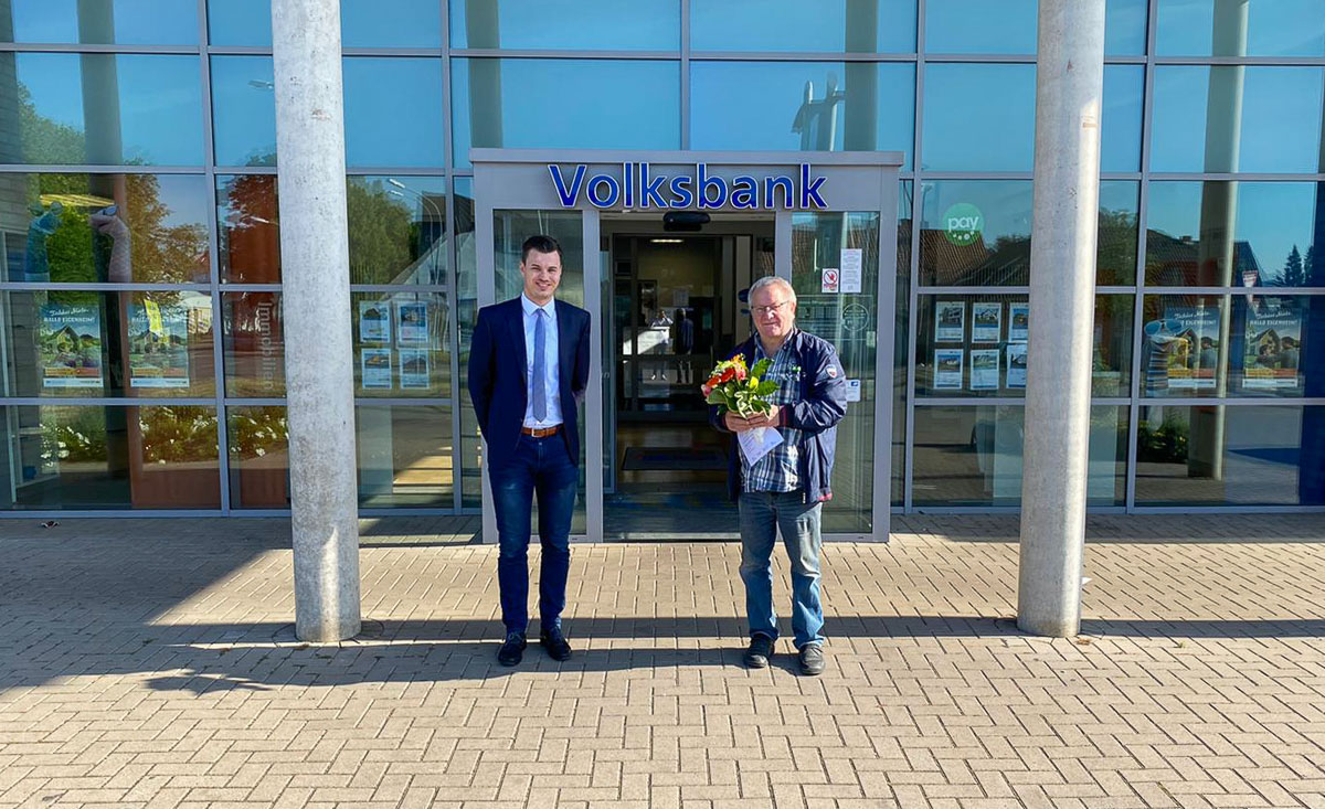 Damit traf ihn das Losglück zum zweiten Mal. Der glückliche Gewinner weiß bereits, wofür er den Geldbetrag einsetzt. Er möchte davon seiner besseren Hälfte und sich ein E-Bike kaufen. Volksbank-Mitarbeiter Alexander Grages überreichte Bernd Appel jetzt den Gewinn mit einem Blumenstrauß vor der Geschäftsstelle Rinteln Nordstadt.