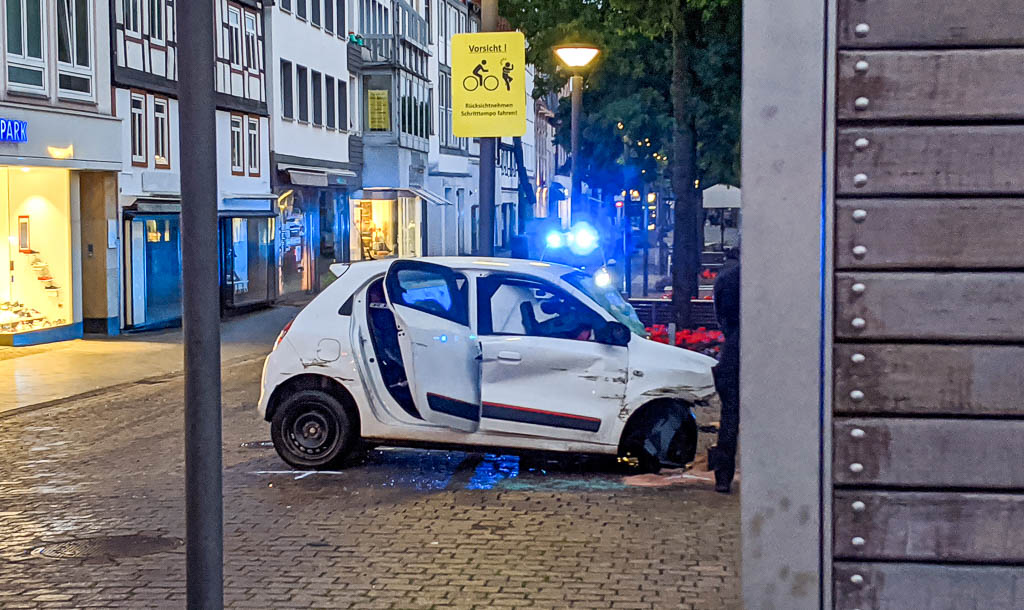 Der Unfall ereignete sich, wie bereits berichtet, am 1. Juli kurz nach 21:00 Uhr, als der weiße Renault Twingo mit offenbar überhöhter Geschwindigkeit über die Weserbrücke fuhr und dann gegen das „Family Land“-Geschäft prallte. Dort zerstörte er ein Schaufenster, riss einen Zigarettenautomaten von der Wand und schleuderte gegen ein Hinweisschild und einen Fahrradständer.