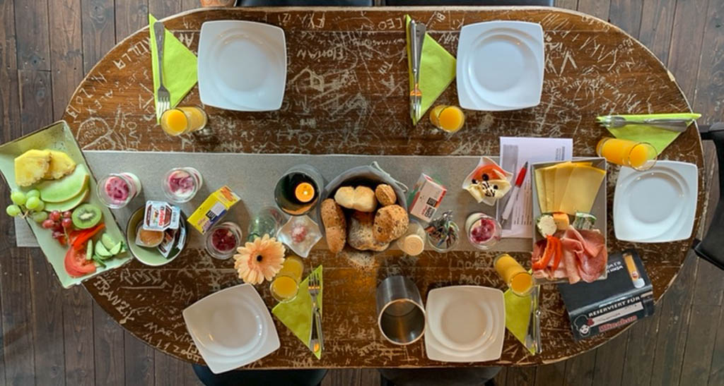Für die Gäste ändert sich in Zeiten der Pandemie nur wenig. Sie müssen beim Betreten und Verlassen, sowie am Buffet-Tisch eine Mund-Nasen-Maske tragen und werden von „vermummtem“ Personal bedient. Pro Tisch dürfen nur maximal 10 Personen sitzen. „Wer mit größeren Gruppen frühstücken möchte, dem reservieren wir gerne mehrere Tische – natürlich mit dem vorgeschriebenen Abstand“, erklärt „Frühstücks-Direktorin“ Selina Klatte. Sie und ihre Kolleginnen nehmen außerdem kleinere Änderungen vor. So werde es zukünftig Thermoskannen am Tisch geben. „Dadurch verhindern wir lange Schlangen im Thekenbereich.“