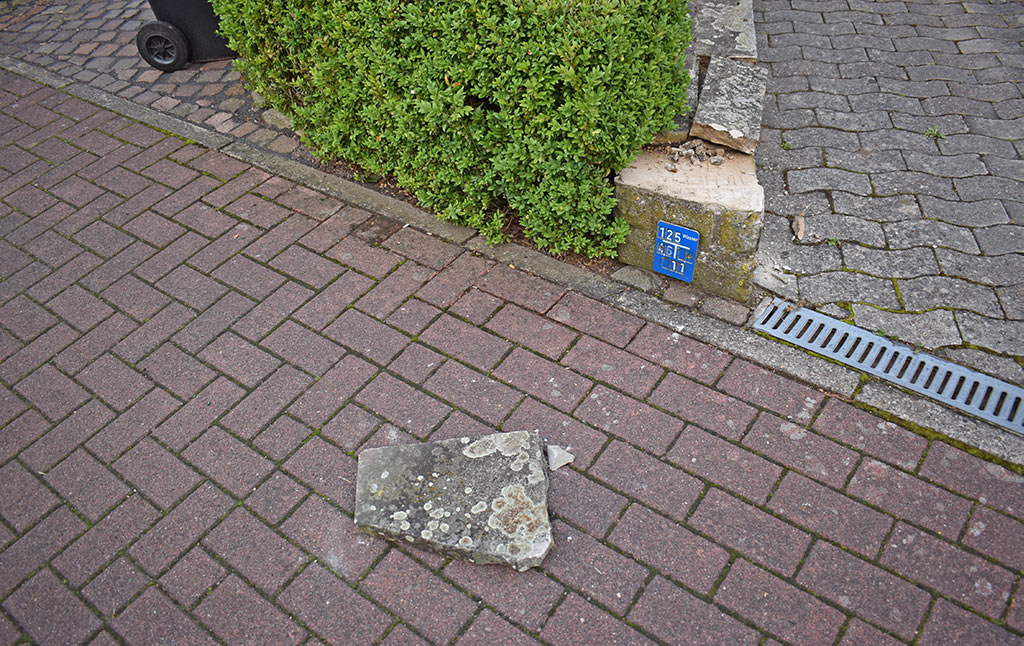 Ein bislang unbekannter PKW-Fahrer ist möglicherweise beim Wendeversuch in einer Hofeinfahrt gegen eine Sandsteinmauer gefahren und hat diese erheblich beschädigt.