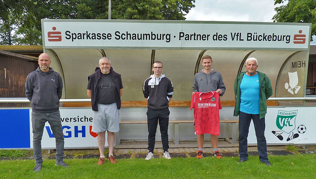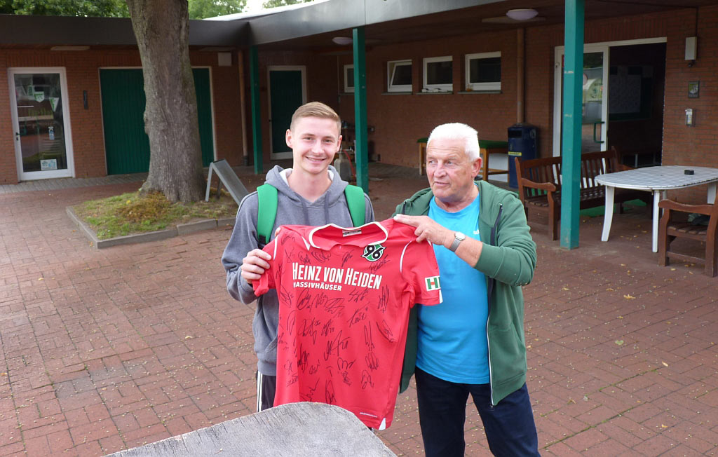 Als Überraschung überreichte Sponsoringbeauftragter Jürgen Rinne dem überzeugten Hannover-96-Fan ein Trikot, das mit den Unterschriften aller Mitglied der 96-Profimannschaft versehen ist. Wie es jetzt beruflich weitergeht, da muss er sich noch gedulden, denn die Zusagen für das avisierte Studium werden erst Mitte August gegeben. Hingegen weiß sein Nachfolger Kevin Dewucki, der ebenfalls anwesend war und sich mittlerweile einarbeiten konnte, das sein Starttemin beim VfL der 1. August 2020 ist. (pr/Foto: pr)