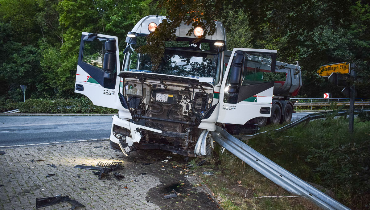 Im Einmündungsbereich prallten die beiden Fahrzeuge aufeinander, wobei der LKW nach links in die Leitplanken der Zufahrt zu einem Resthof fuhr und dort verkeilt liegen blieb. Der Pkw wurde rund 25 Meter in Richtung Lauenhagen geschleudert. Der Fahrer des Sattelzuges blieb unverletzt.