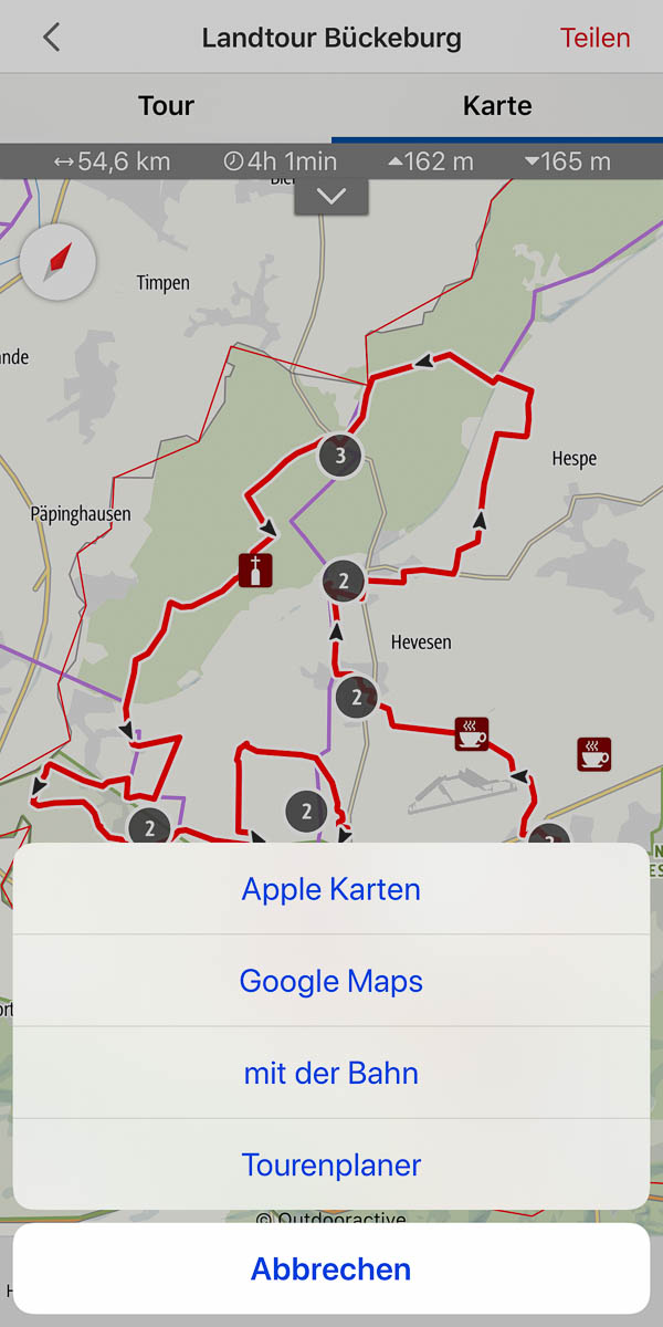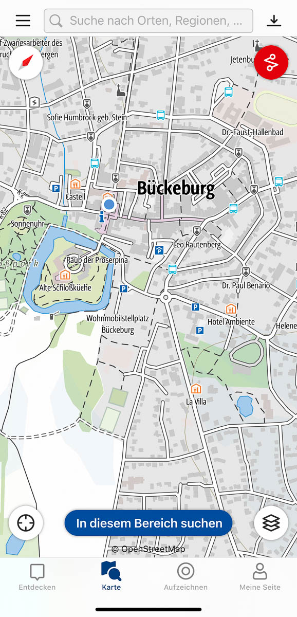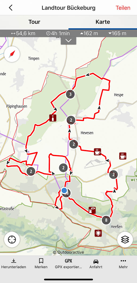 Dabei greift die „Schaumburger Land“-App auf Datenbankmaterial zu, das auch die überarbeitete Internetseite des Tourismusmarketings speist. Strukturierte Inhalte sorgen dafür, dass Beschreibungen, Texte und Pläne nur ein Mal erstellt werden müssen und auf vielen Plattformen abrufbar sind. Dabei spielt es keine Rolle, ob man auf eine vorgefertigte Radroute zurückgreift, oder liebe eigene Wegstrecken erstellt. Der Start kann an einem beliebigen Wegpunkt erfolgen. Die GPS-Funktion des eigenen Smartphones sorgt für die Orientierung auf der Tour, die sich jederzeit anhalten und fortsetzen. Als Kartenmaterial dienen wahlweise Daten des Unternehmens Outdooractive (das für die App verantwortlich zeichnet), der beliebte Dienst „Open Street Map“ oder topografische Wanderkarten.