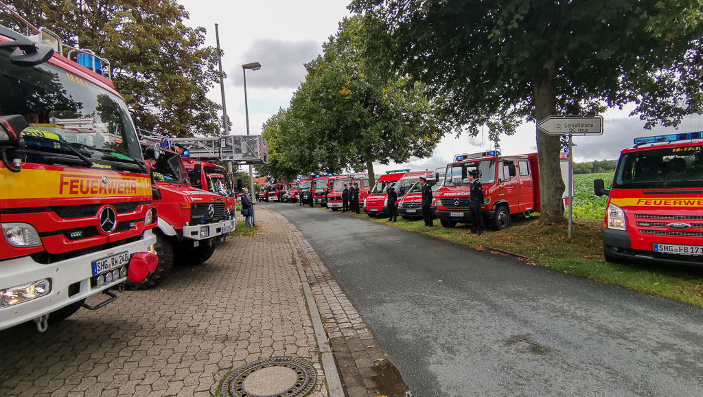 Daher erarbeitete der stellvertretende Ortsbrandmeister aus Scheie, Dennis Wilharm, einen traditionellen Empfang des Brautpaares durch die Ortsfeuerwehren der Stadt Bückeburg am Scheier Feuerwehrhaus. Der Scheier Ortsbandmeister engagiert sich nicht nur für die Sicherheit im Ort, sondern auch im Stadtgebiet und drüber hinaus. So ist er als erfahrene Führungskraft bei der ELW-Gruppe der Stadtfeuerwehr, im Stadtkommando sowie bei der technischen Einsatzleitung des Landkreises Schaumburg ehrenamtlich tätig. Insgesamt nahmen insgesamt über 20 Feuerwehrfahrzeuge aus dem Stadtgebiet am Spalier teil.