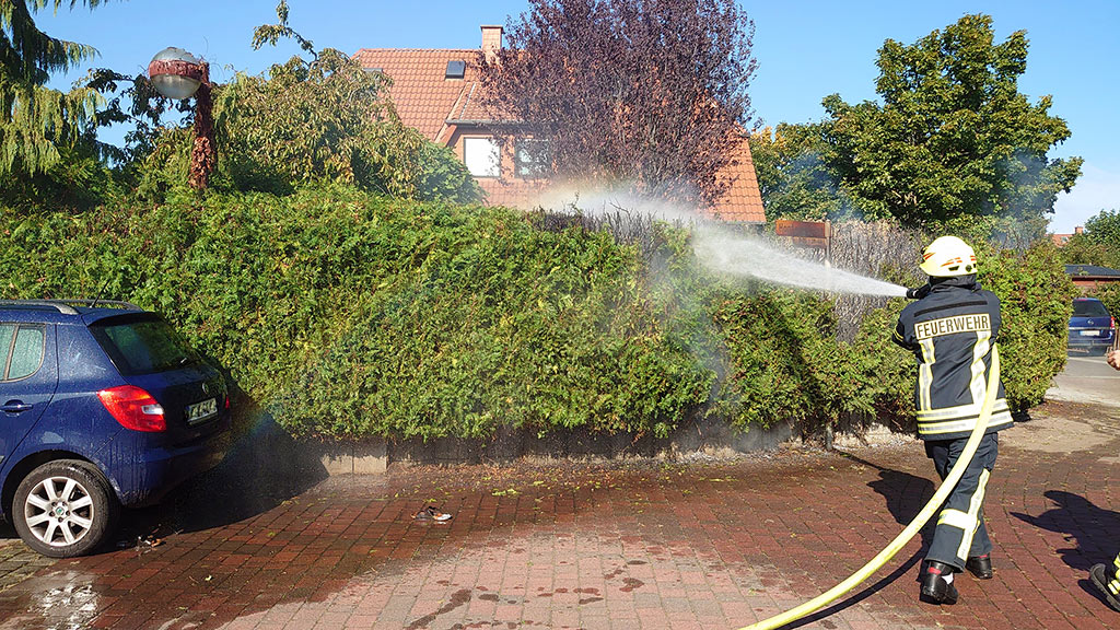 Dort hatte aus bisher ungeklärter Ursache eine Hecke Feuer gefangen. Durch das schnelle Eingreifen der Anwohner, die Löschversuche mit Gartenschläuchen unternahmen, konnte ein an der Hecke stehender PKW vor den Flammen und der Hitze geschützt werden. Nach dem Eintreffen der Feuerwehr Hagenburg wurden zwei Rohre zur Brandbekämpfung eingesetzt und das Feuer zügig gelöscht. Anschließend kontrollierte die Feuerwehr Hagenburg die Brandstelle mit einer Wärmebildkamera auf Glutnester und wässerte den Bereich.