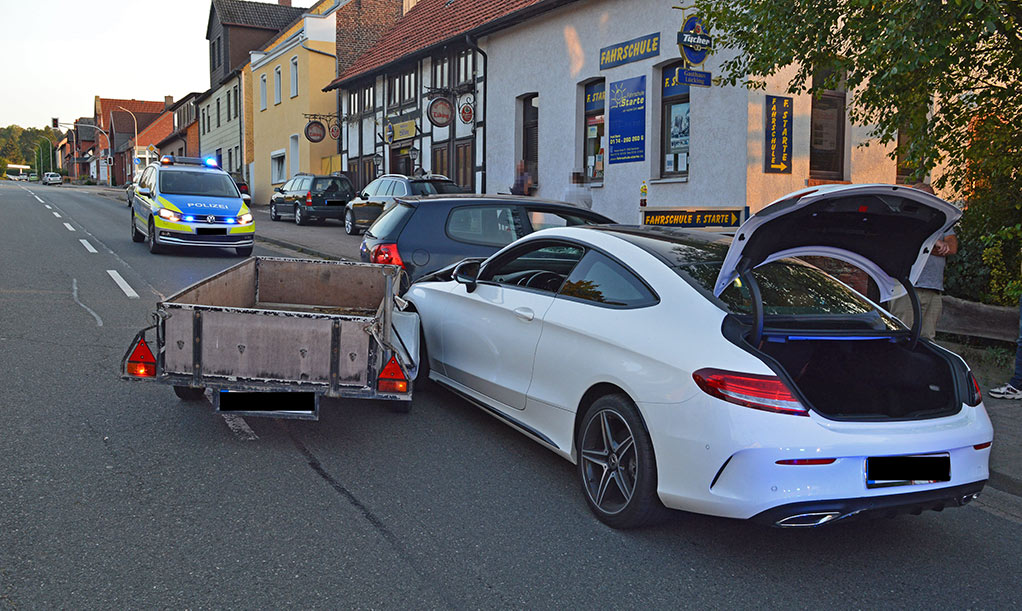 (Obernkirchen) Am gestrigen Dienstag befuhr ein 50-jähriger Mann aus dem Auetal mit seinem VW Golf samt Anhänger gegen 18:20 Uhr die Rintelner Straße in Obernkirchen in Richtung Buchholz und beabsichtigte, in Höhe der Annastraße nach rechts auf ein Grundstück einzubiegen. Nach eigenen Angaben, die durch unabhängige Zeugen bestätigt wurden, blinkte er rechts und scherte etwas nach links aus.