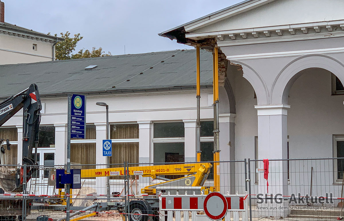 (Bückeburg) Nach dem schweren Verkehrsunfall, bei dem ein Auto gestern frontal gegen eine Säule der Bahnhofsvorhalle in Bückeburg geprallt war (wir berichteten), machten sich heute Bauexperten an die Arbeit und zogen mit schwerem Gerät die eingestürzten Säulenteile unter dem Dach des Gebäudes hervor.