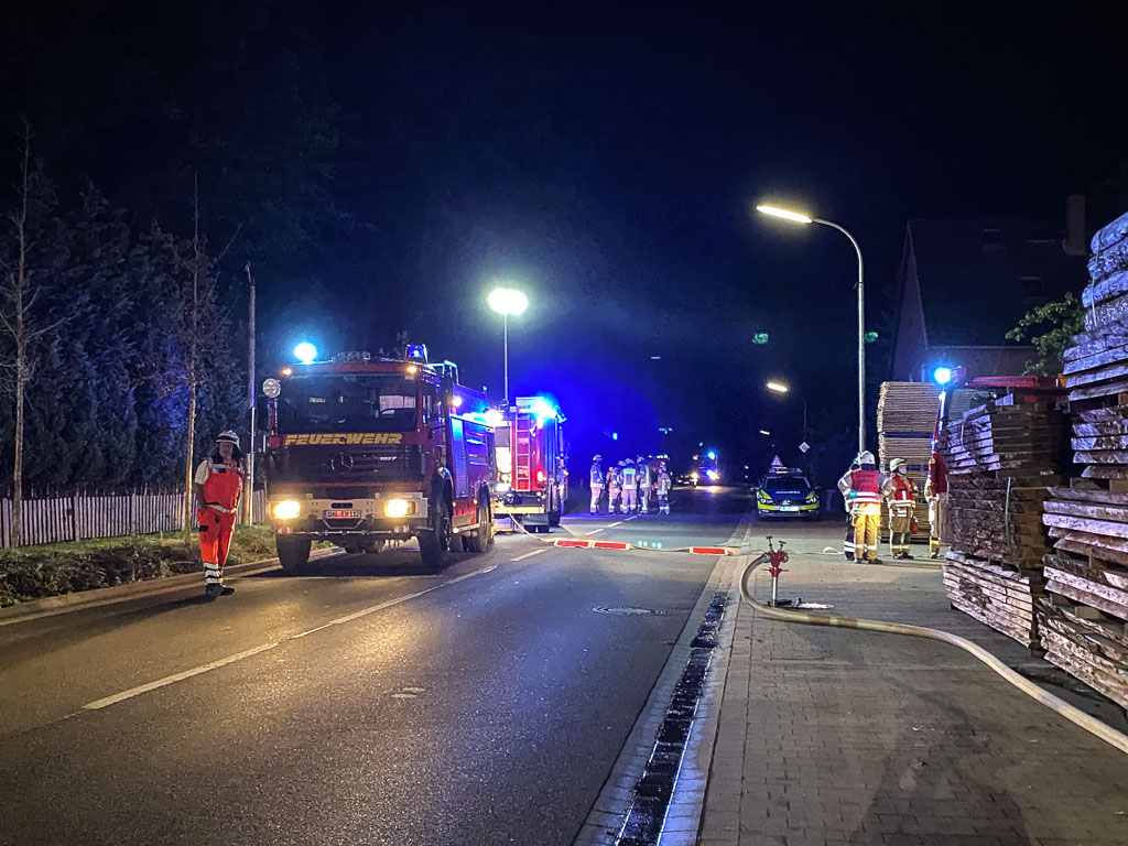 (Auhagen) Zu einem Brand in einem Sägewerk wurden Dienstagnacht gegen 0:25 Uhr die Feuerwehren Auhagen-Düdinghausen, Sachsenhagen, Nienbrügge, Hagenburg, Wölpinghausen und Stadthagen in die Straße „Auf den Rähden“ nach Auhagen alarmiert.