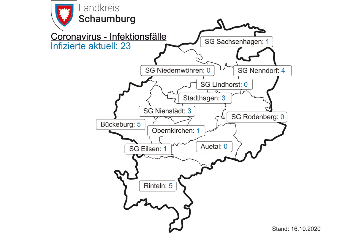 Wie die Pressestelle des Kreises Schaumburg heute mitteilte, sind mit Datum vom 15.10.2020 kreisweit 23 Menschen akut mit dem Coronavirus infiziert.