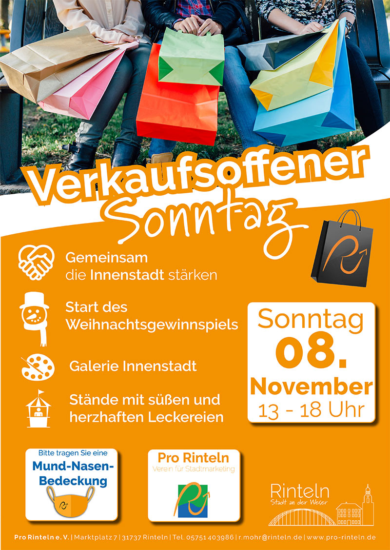Weiter teilt Pro Rinteln mit: „Bereits seit Jahresbeginn kämpft der Einzelhandel mit den Verlusten, die in Folge der Corona Pandemie entstanden sind. Wir versuchen mit jedem verkaufsoffenen Sonntag diesem entgegenzuwirken und deswegen ist gerade dieser verkaufsoffene Sonntag so wichtig. Von den aktuellen Einschränkungen hat die Bundesregierung den Einzelhandel bewusst ausgenommen, um die Wirtschaftsketten nicht über die Maßen zu schädigen. Der Einzelhandel gehört zum Leben dazu, eben auch, wenn das Leben von Corona beeinflusst wird. So braucht man Bekleidung, Schuhe und Schreibwaren genauso wie Lebensmittel und andere wichtige Dinge. Das Virus ist da und es wird uns so schnell auch nicht verlassen, egal ob Montag bis Freitag oder Samstag und Sonntag. Jeden Tag aufs Neue müssen wir lernen, mit dem Virus umzugehen. Gerade für den Einzelhandel und die Innenstadt suchen wir immer wieder neue Konzepte um ein gemeinsames Miteinander zu ermöglichen.“