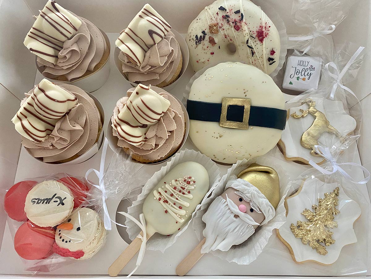 Box 4: „Sweet Box“ mit Cupcakes, Donuts, Cakesicles, Macarons, Keksen und Schokoladentafeln (14 Teile + 2 Bonus-Teile, Preis: 35 €)