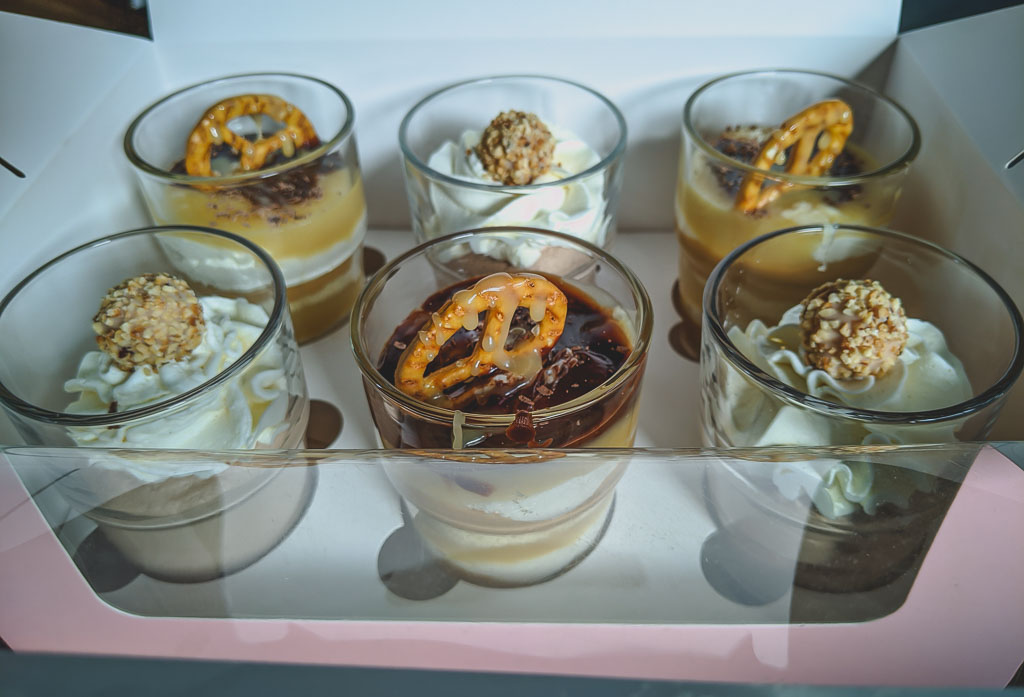 Box 7: „Feinschmecker Box“ (6 Teile), je drei Dessert-Gläser mit Salted Caramel und Peanut Butter Füllung und drei Dessert-Gläser mit einer Füllung, die nach dem italienischen Maler und Architekten Giotto di Bondonegiotto benannt ist. (Preis: 28 €, inklusive Gläser)