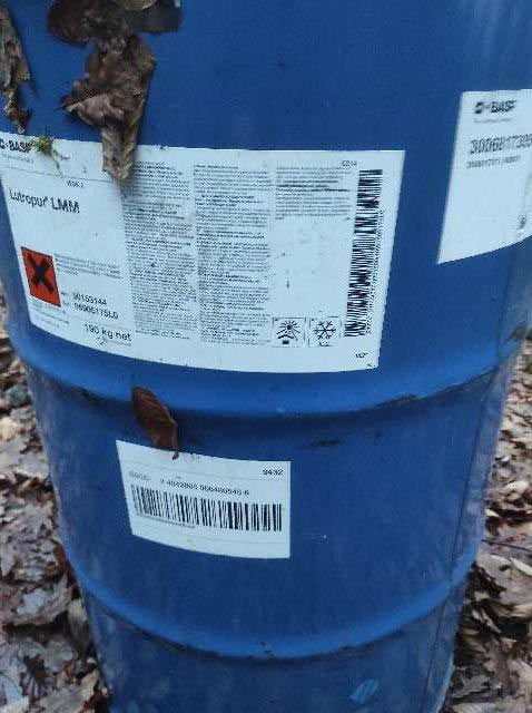 Unter anderem wurde neben einer Mikrowelle, einem Laptop, einem Akkuschrauber auch ein geschlossenes blaues Metallfass des Herstellers BASF, Aufschrift Lutropur LMM, mit wahrscheinlich Restinhalten eines Industriereinigers aufgefunden.