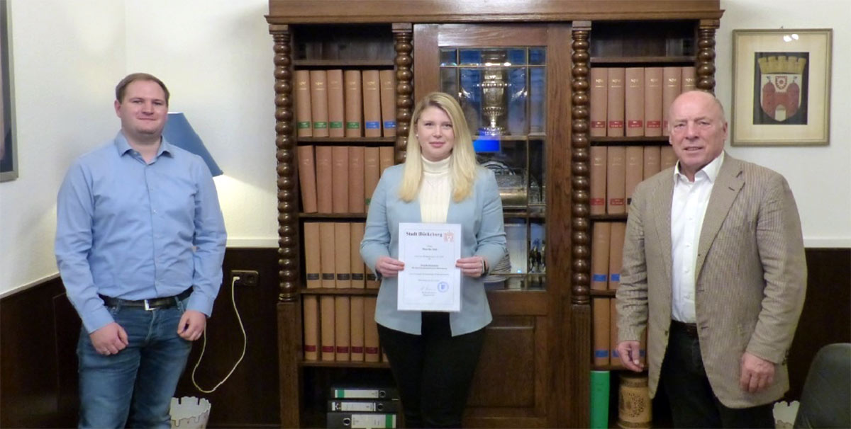 Im Rahmen der Urkundenübergabe betonte Bürgermeister Reiner Brombach seine Freude darüber, dass mit Mareike Iselt eine im eigenen Haus ausgebildete Nachwuchskraft in dieser Position eingesetzt und weiter gefördert wird.