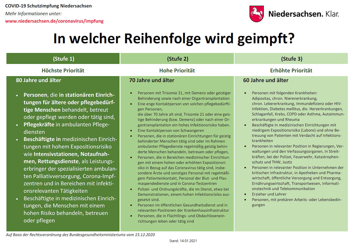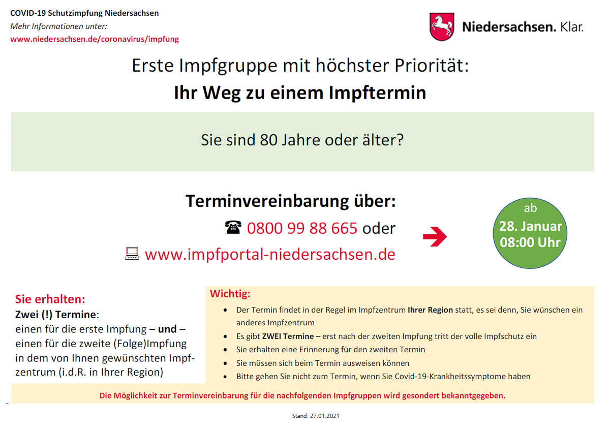 (Niedersachsen) Ab dem morgigen Donnerstag, dem 28. Januar, 8 Uhr, können Bürger aus Niedersachsen, die 80 Jahre und älter sind, einen Impftermin vereinbaren oder sich auf eine Warteliste für einen Termin setzen lassen.
