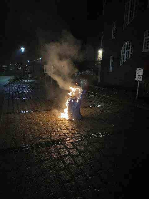 Gegen 21.50 Uhr fing dann ein Kunststoffabfallbehälter, gefüllt mit Altpapier, auf dem Kirchplatz in der Nähe des Kindergartens Feuer. Der Polizei Bückeburg liegen Zeugenhinweise vor, nachdem zwei dunkel gekleidete, junge Männer den zur Abholung bereitgestellten Müllbehälter auf den Kirchplatz zogen und mit hoher Wahrscheinlichkeit vorsätzlich in Brand steckten. Die Polizei fand die Abfalltonne im Vollbrand vor. Die alarmierte Feuerwehr Obernkirchen löschte das Feuer. Eine Gefahr für umliegende Gebäude bestand nicht.