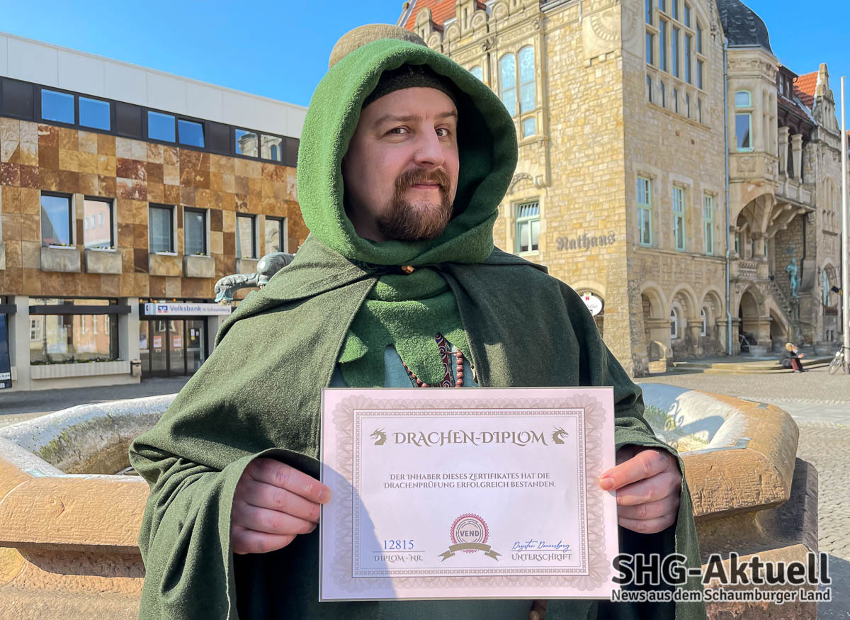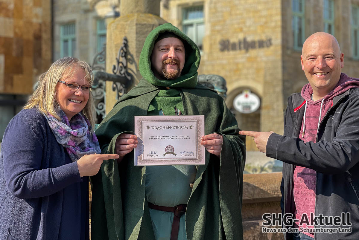 Wenn man nicht mehr weiter weiss, hilft Drystan Donarsborg übriens gerne mit Hinweisen weiter. Die Mitarbeiterinnen der Tourist-Info Bückeburg durften die Drachenprüfung bereits probespielen und waren begeistert, verriet Annika Fauth, Fachgebietsleiterin Wirtschaftsförderung der Stadt Bückeburg. Auf der städtischen Internetseite soll der Hinweis auf das neue Abenteuer ebenfalls verlinkt werden.