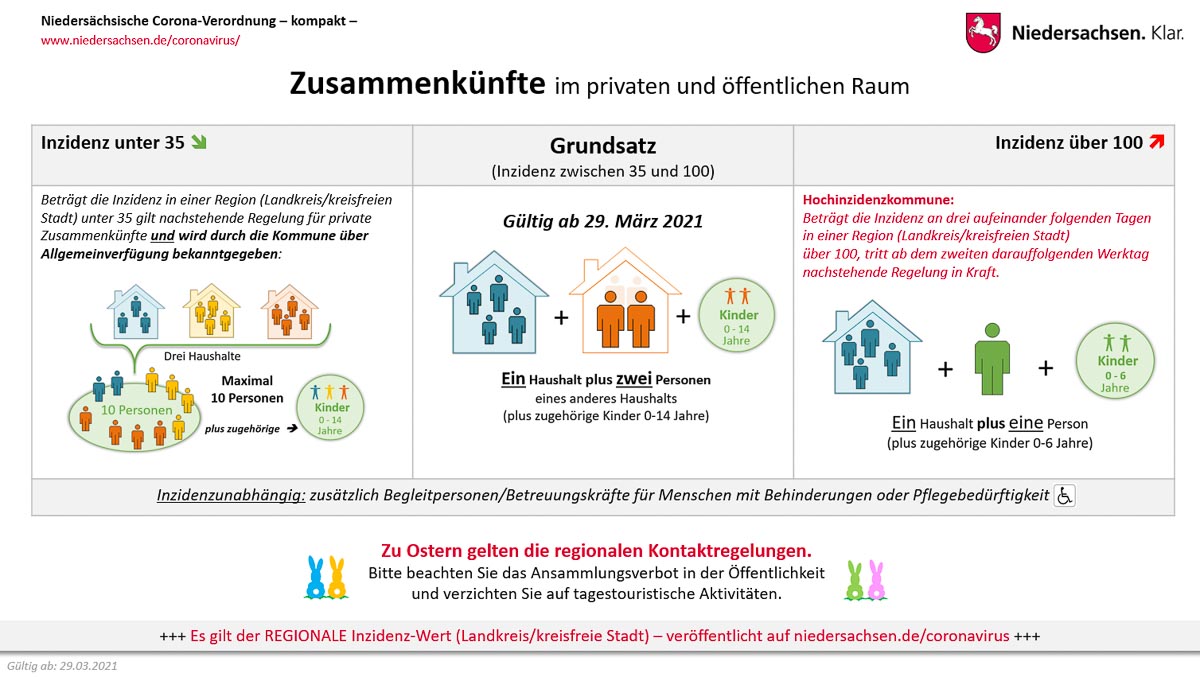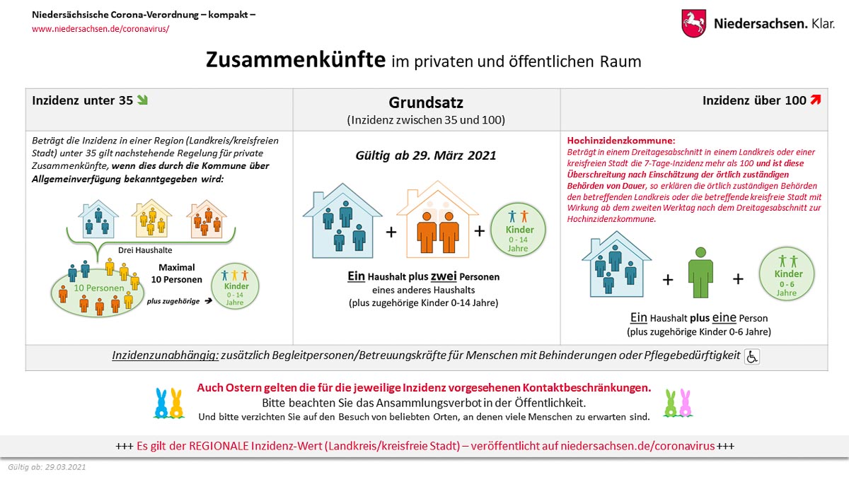 (Niedersachsen) Der Appell der Niedersächsischen Landesregierung lautet in einer Presseerklärung: „Bitte alle Kontakte über Ostern herunterfahren und die Welle brechen!“