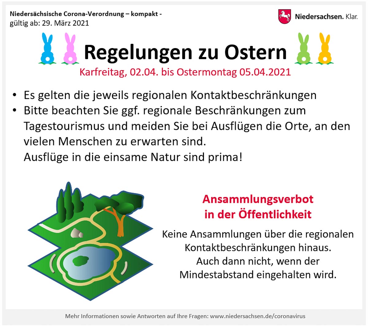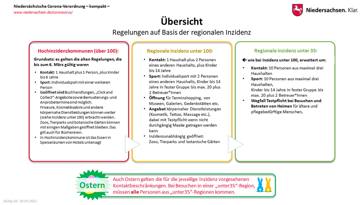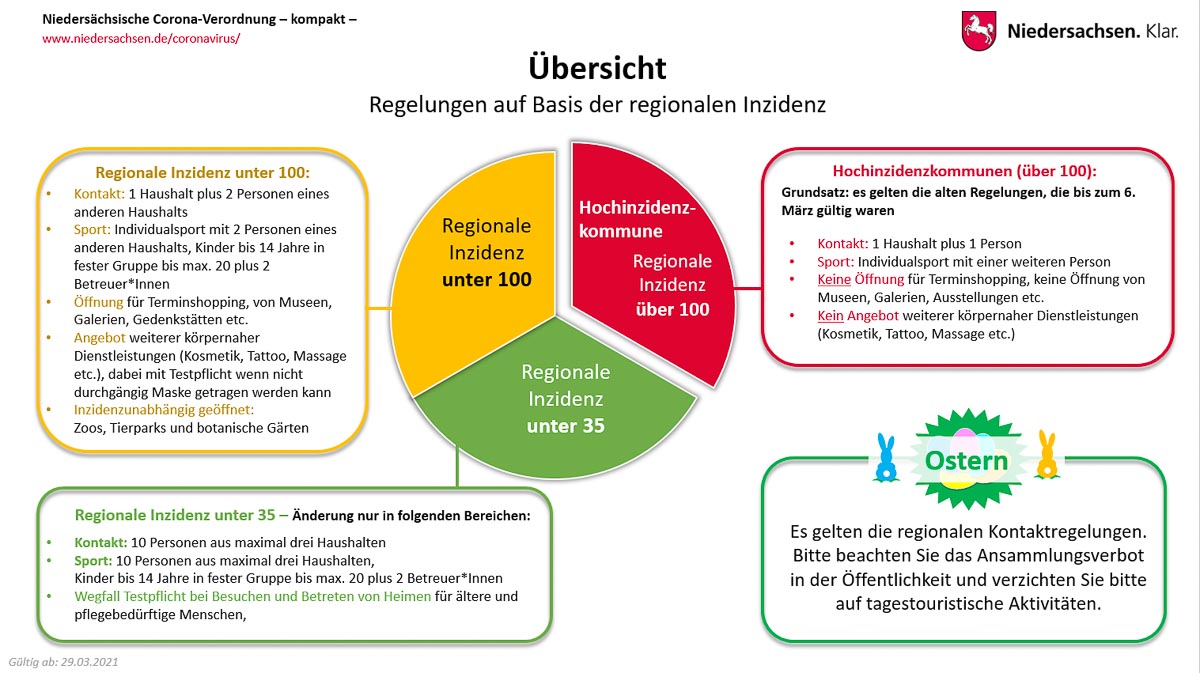 - Alle Bürgerinnen und Bürger in Niedersachsen werden herzlich gebeten, in den Osterferien möglichst zuhause zu bleiben und draußen alle Orte zu meiden, an denen viele Menschen zusammenkommen. Spaziergänge in der freien Natur sind ungefährlich. Polizei und Ordnungsämter werden die Kontrollen rund um touristische Anziehungspunkte verstärken.