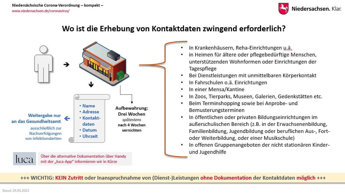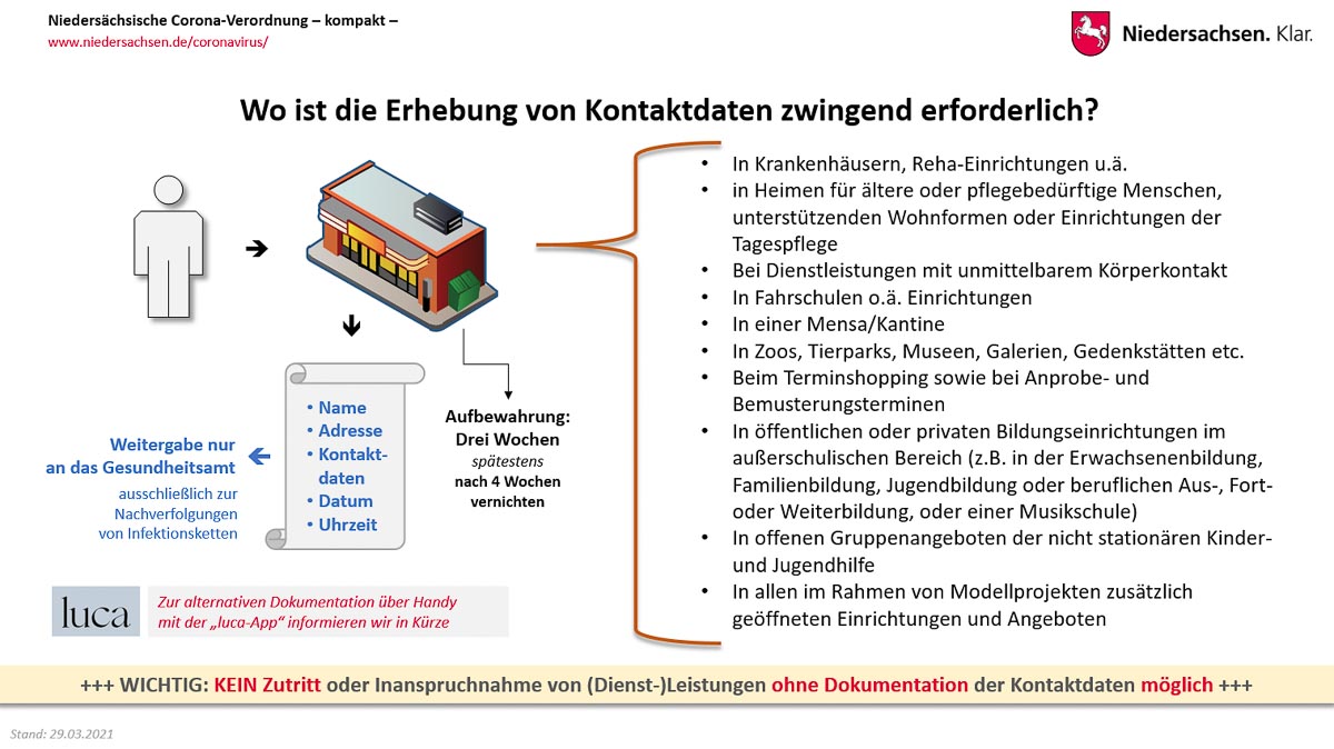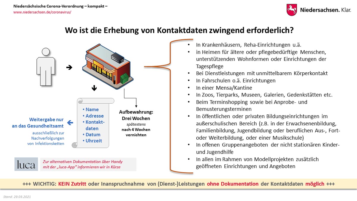 Vom 6. April an sollen in etwa 25 niedersächsischen Kommunen Modellvorhaben laufen, in denen erprobt werden soll, ob mithilfe konsequenter Testungen und einer digitalen Kontaktnachverfolgung die Öffnung weiterer Bereiche des Einzelhandels, der Kultur und des Sports verantwortet werden kann.