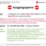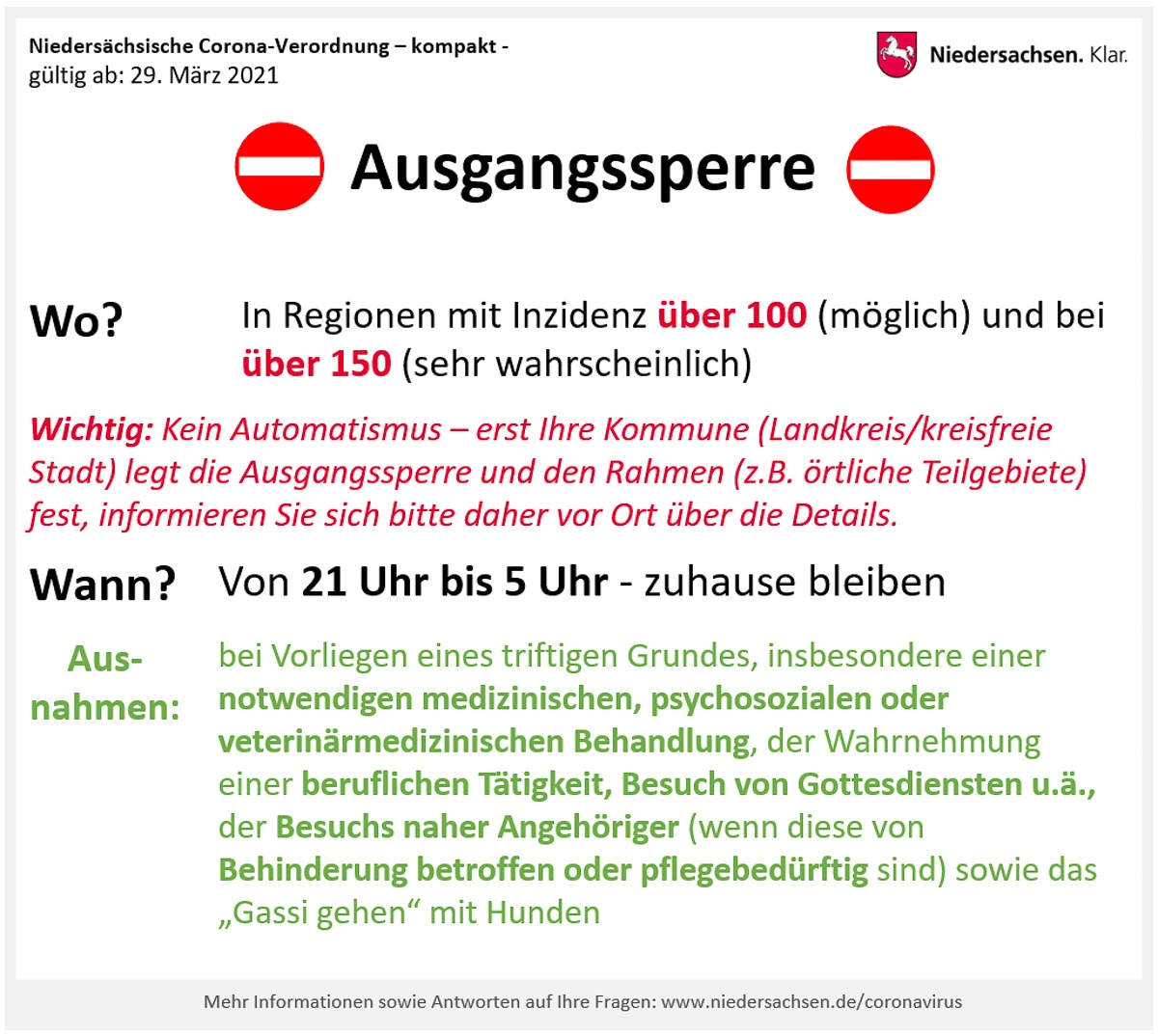 - Ab einer Inzidenz von 150 sollen derartige Ausgangssperren verhängt werden, sofern das Infektionsgeschehen in dem betreffenden Gebiet nicht oder nicht mehr hinreichend einem bestimmten räumlich abgrenzbaren Bereich zugeordnet werden kann und deshalb die Gefahr einer nicht mehr kontrollierbaren Verbreitung des Corona-Virus besteht.