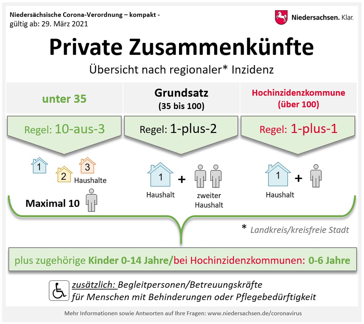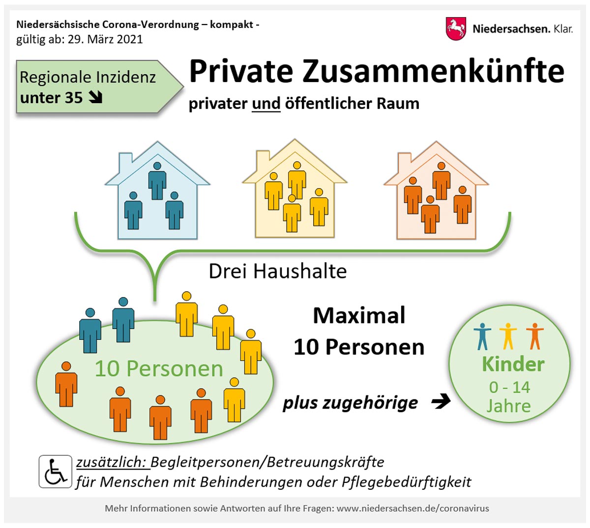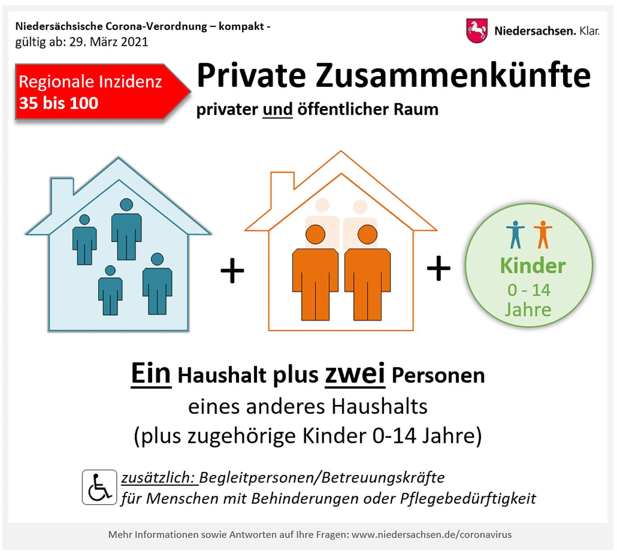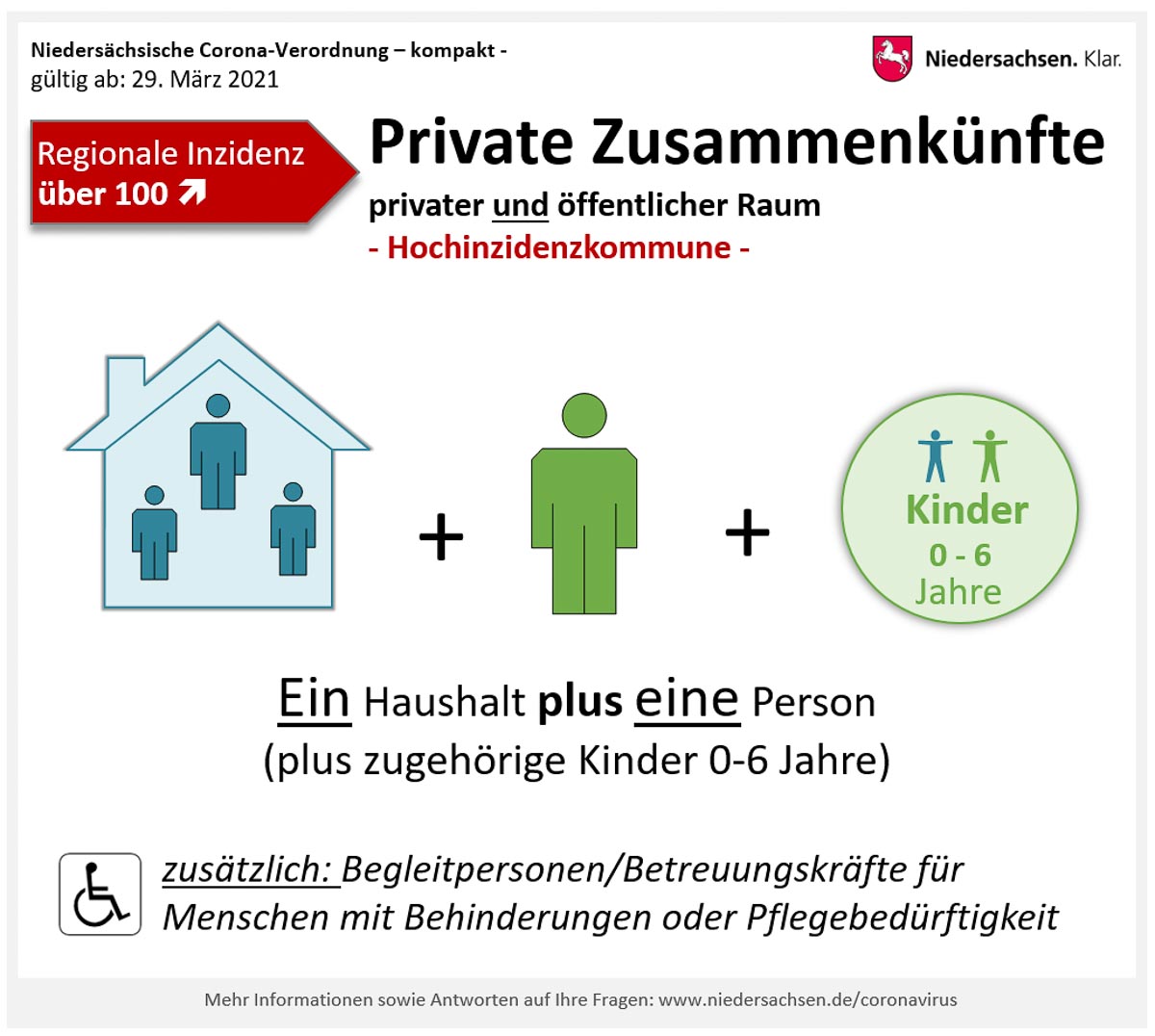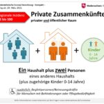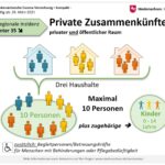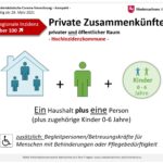 - In Landkreisen und Kreisfreien Städten mit einer Inzidenz von über 100 dürfen sich Personen eines Haushalts höchstens mit einer weiteren Person sowie jeweils mit zugehörigen Kindern bis einschließlich sechs Jahren treffen.
